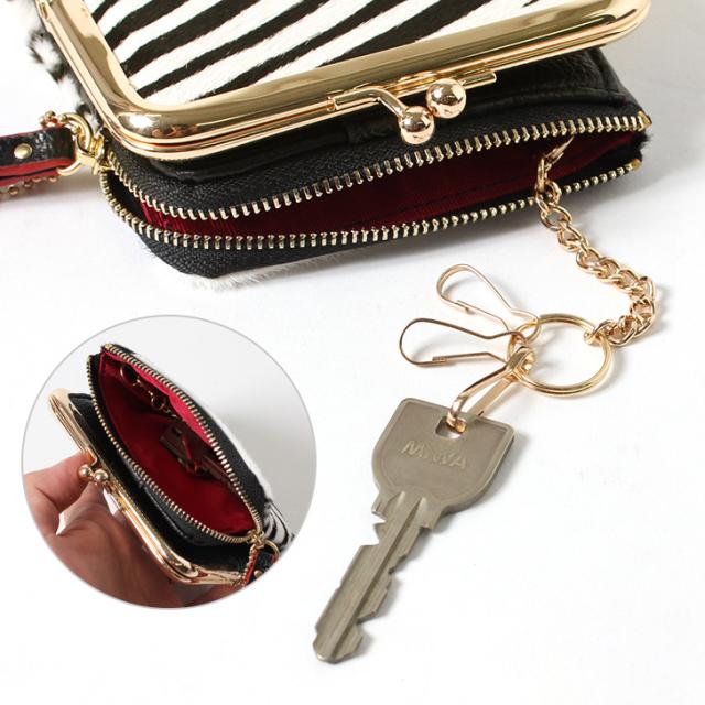 ■仕様:【外側】がま口ポケット×1、ファスナーポケット×1、オープンポケット×1 【内側】札入れ×1、カードポケット×9、Dカン×1、キーリング×1、キーフック×3