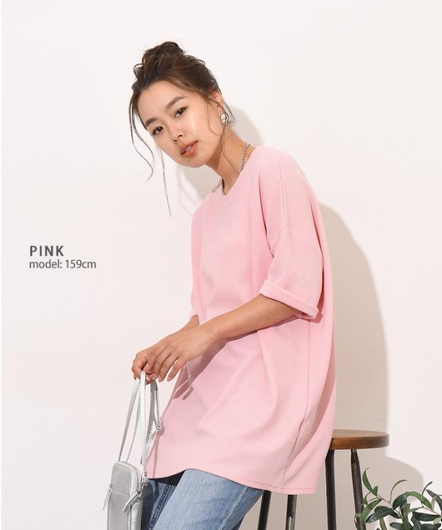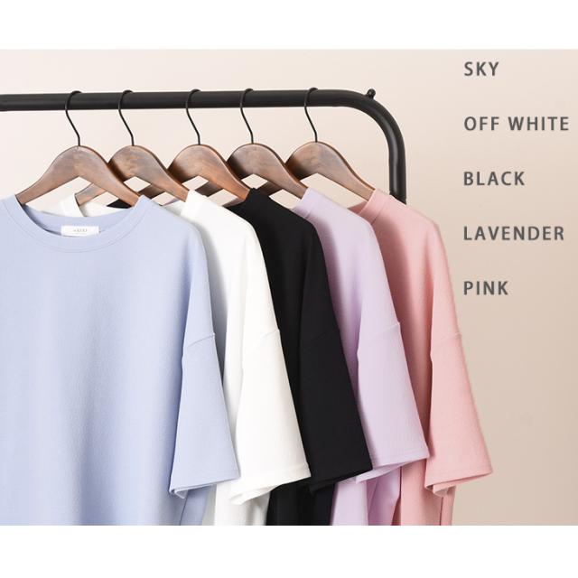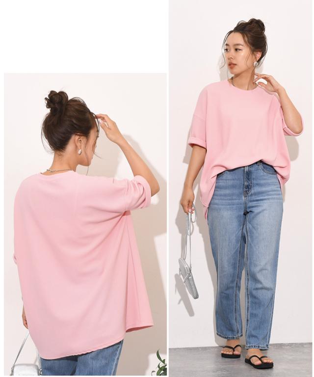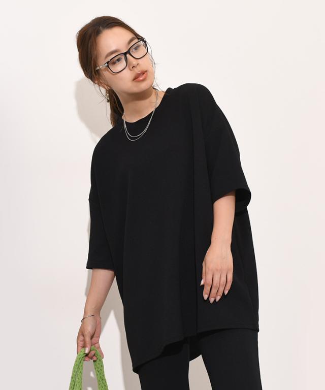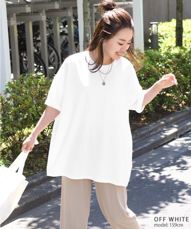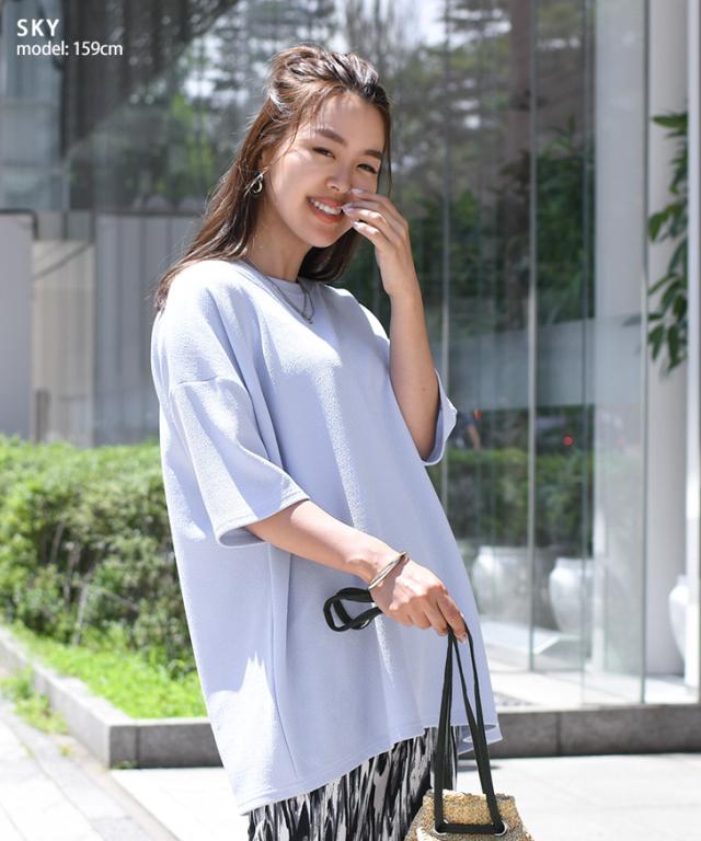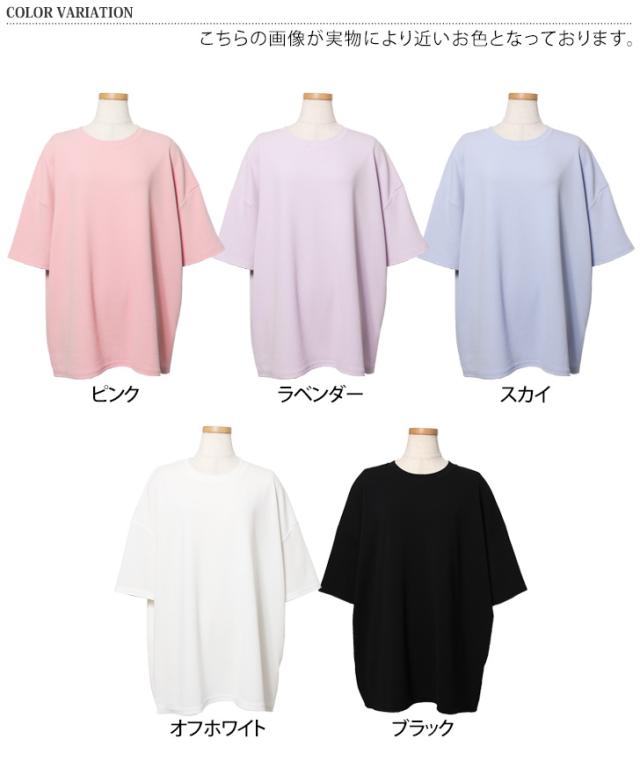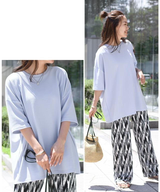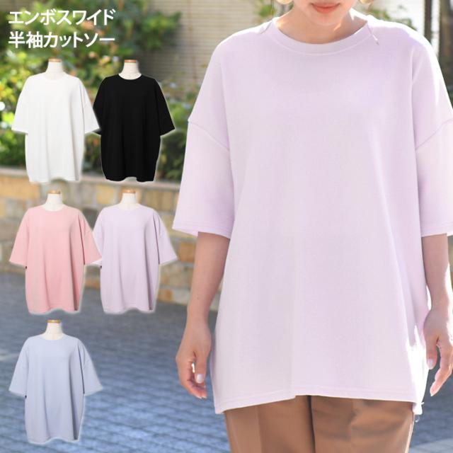 新作 ベーシックエンボスワイド半袖カットソー レディース トップス Tシャツ 速乾 半袖 5分袖 ロング丈 チュニック ゆったり 大きめ 体型カバー リラックス カジュアル ルーズ 無地 シンプル イージーケア 旅行