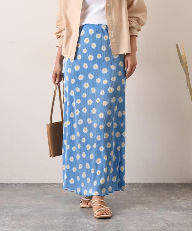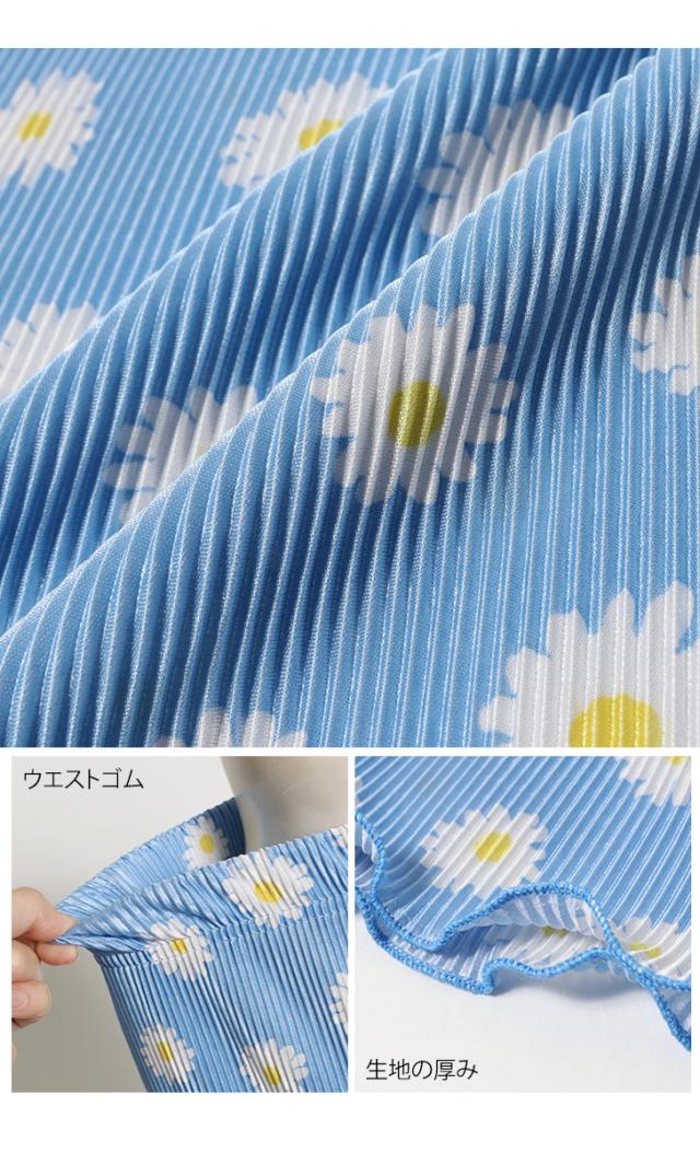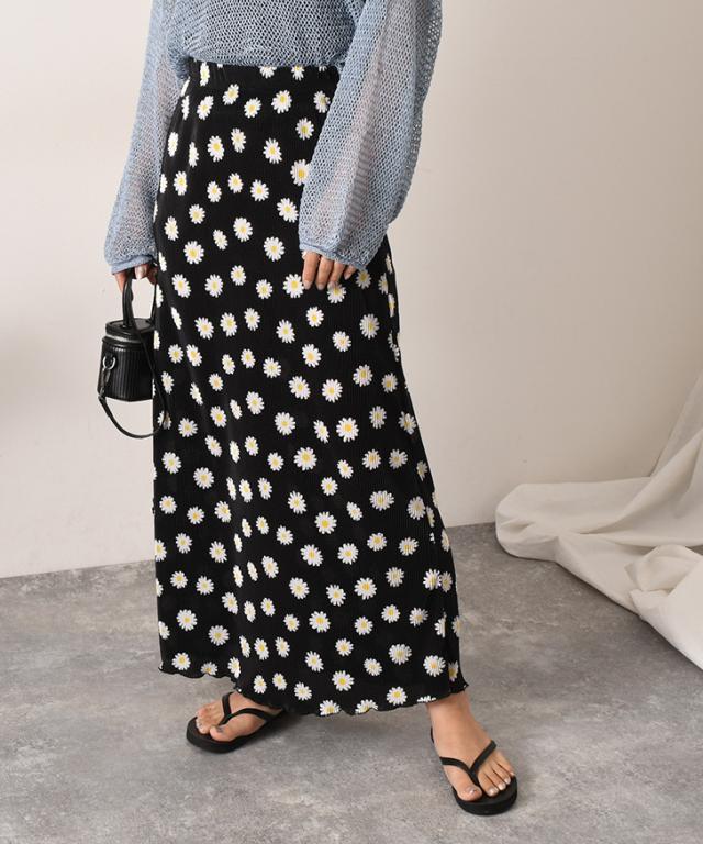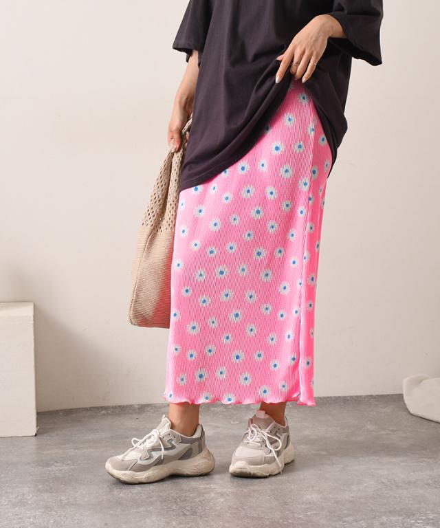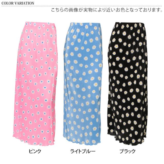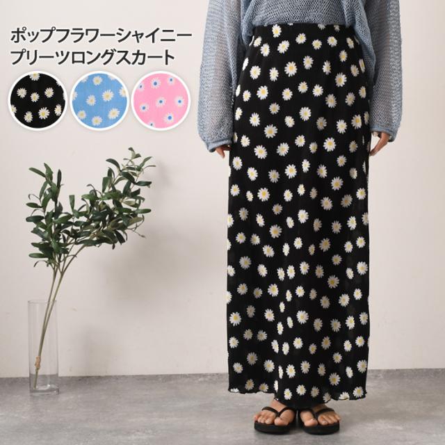 新作 ポップフラワーシャイニープリーツロングスカート レディース ボトムス 夏 ロングスカート マキシスカート ロング丈 花柄 カジュアル きれいめ 可愛い レトロ 華やか 光沢 美脚 脚長 ウエストゴム Iライン