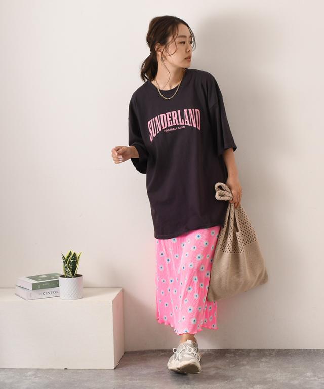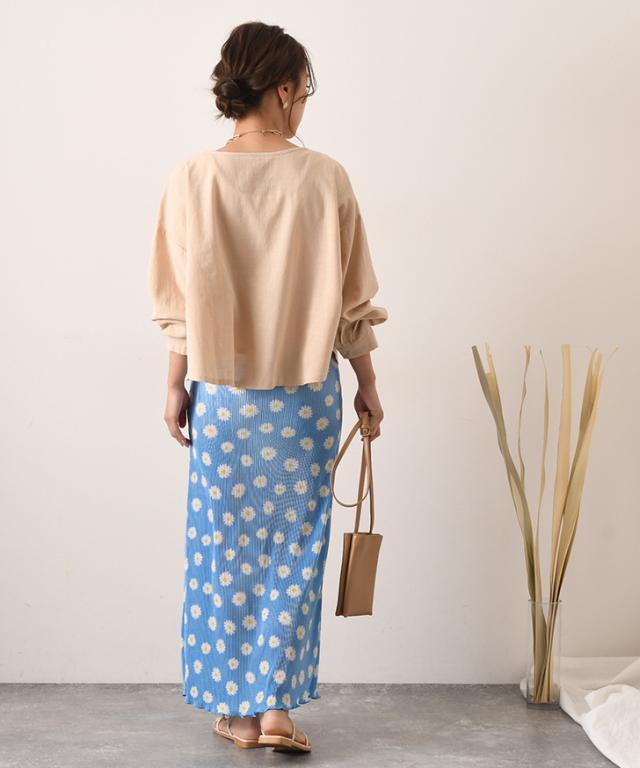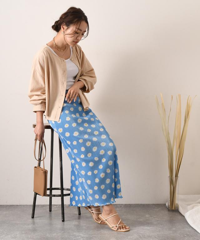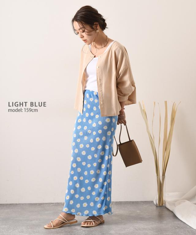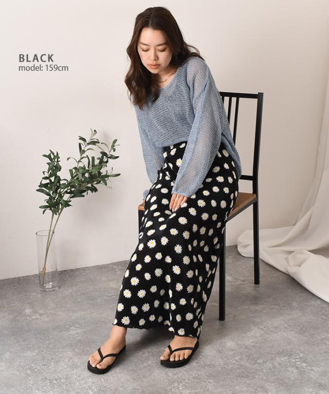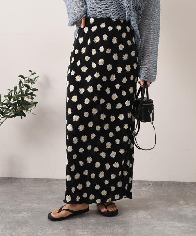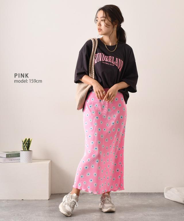 新作 ポップフラワーシャイニープリーツロングスカート レディース ボトムス 夏 ロングスカート マキシスカート ロング丈 花柄 カジュアル きれいめ 可愛い レトロ 華やか 光沢 美脚 脚長 ウエストゴム Iライン