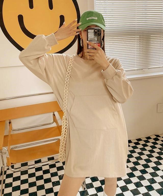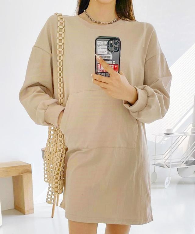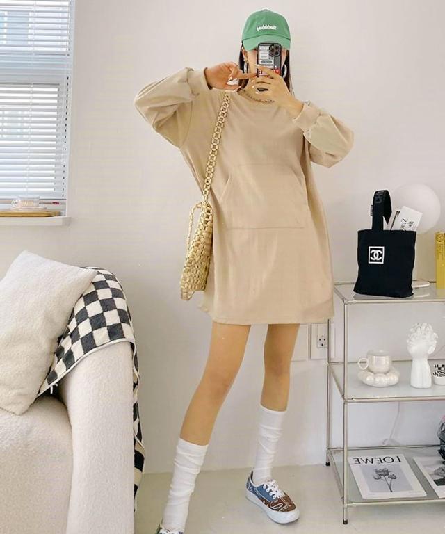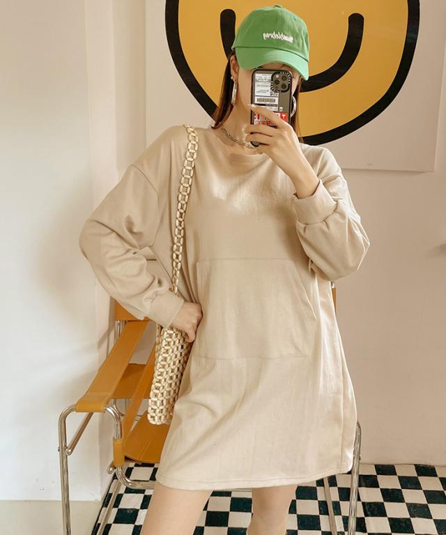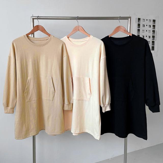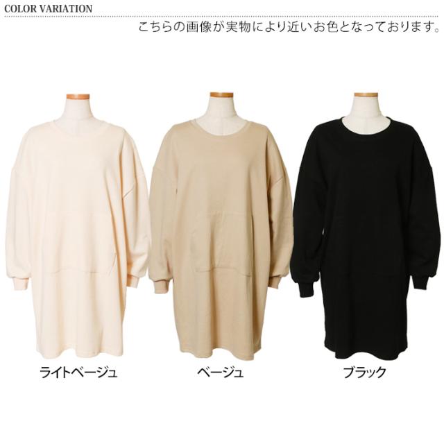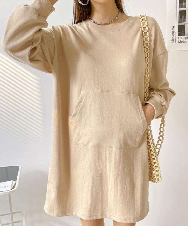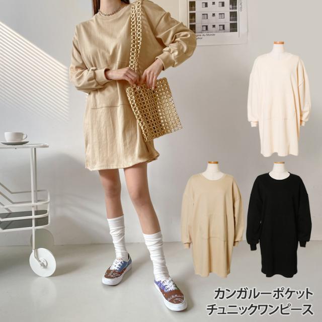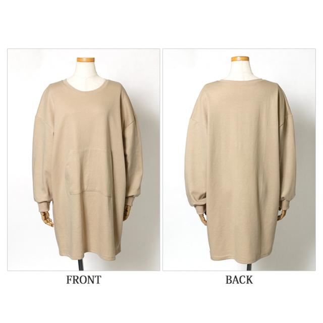 新作 スウェットカンガルーポケットチュニックワンピース レディース トップス 長袖 ゆったり 柔らか コットン混 綿混 ロングワンピース 膝丈 膝下 膝上 体型カバー スエット レイヤード 重ね着 大人 リラックス