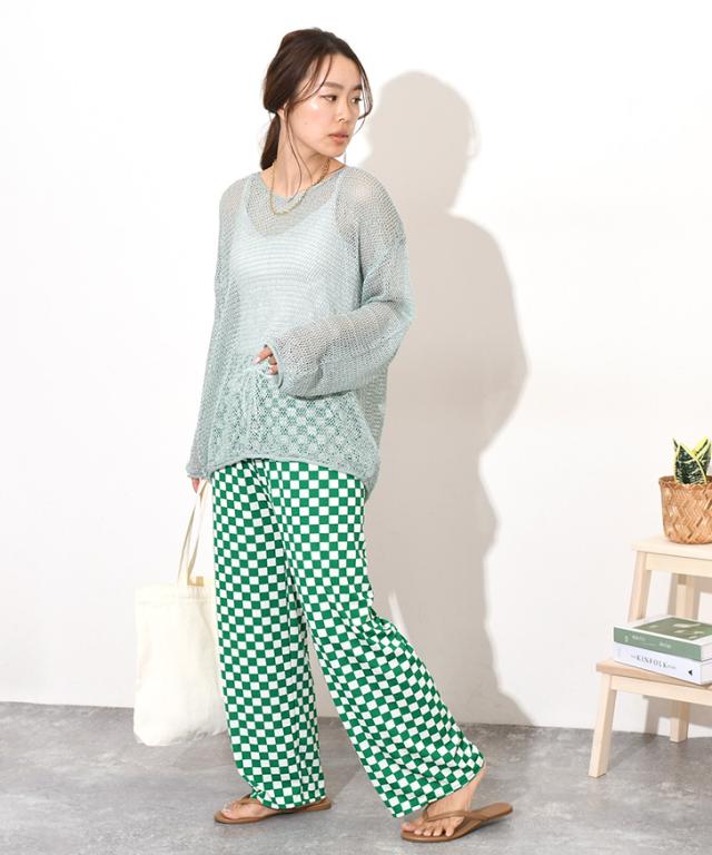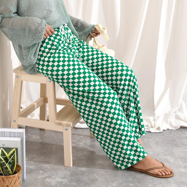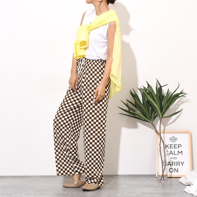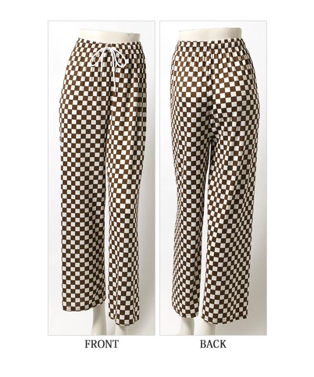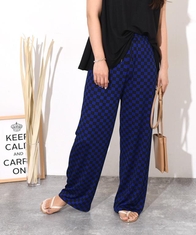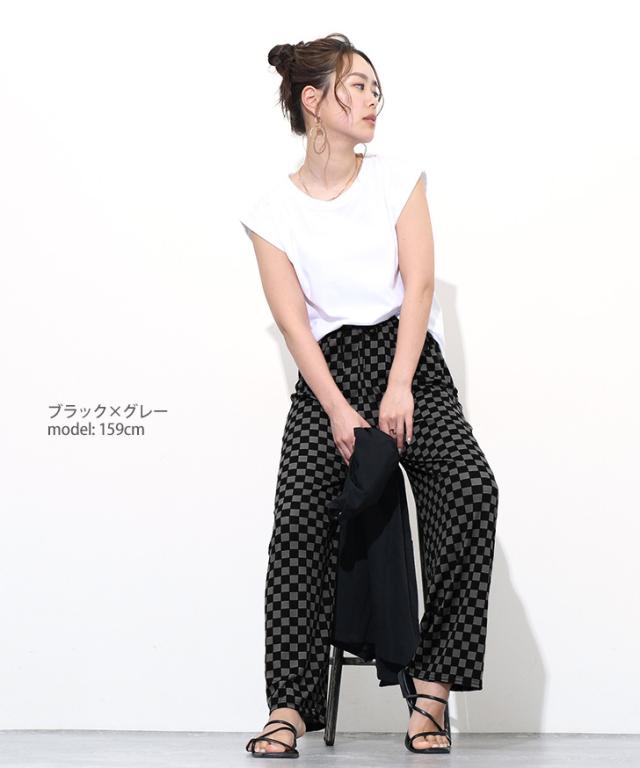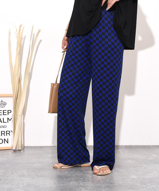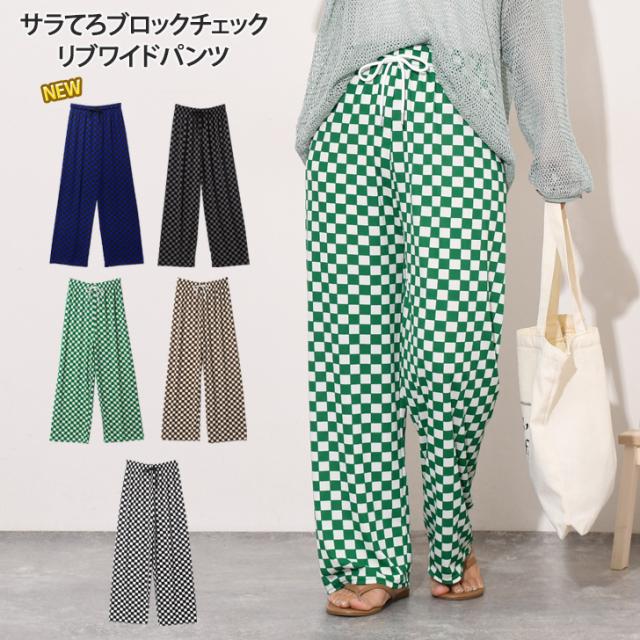 新作 サラてろブロックチェック柄リブワイドイージーパンツ レディース ボトムス ワイドパンツ イージーパンツ 大きいサイズ 春 夏 カジュアル フラッグチェック バイカラー 配色 ウエストゴム ゆったり 体型カバー おしゃれ モノクロ