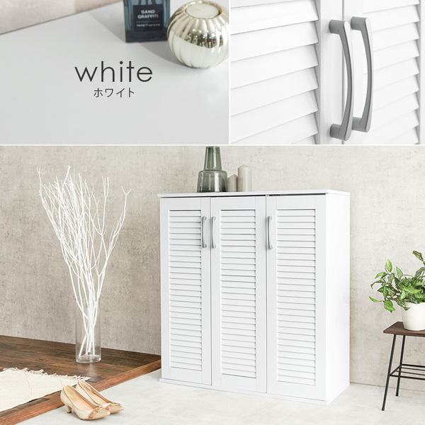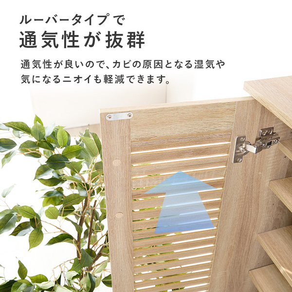 通気性が良いルーバー扉と背面の通気口で湿気や臭いがこもりにくいシューズラック。連結金具付きで縦にも横にも連結可能、大量収納可能な2点セット
