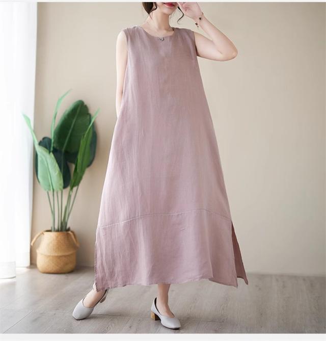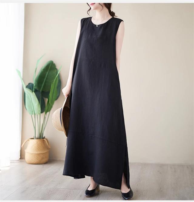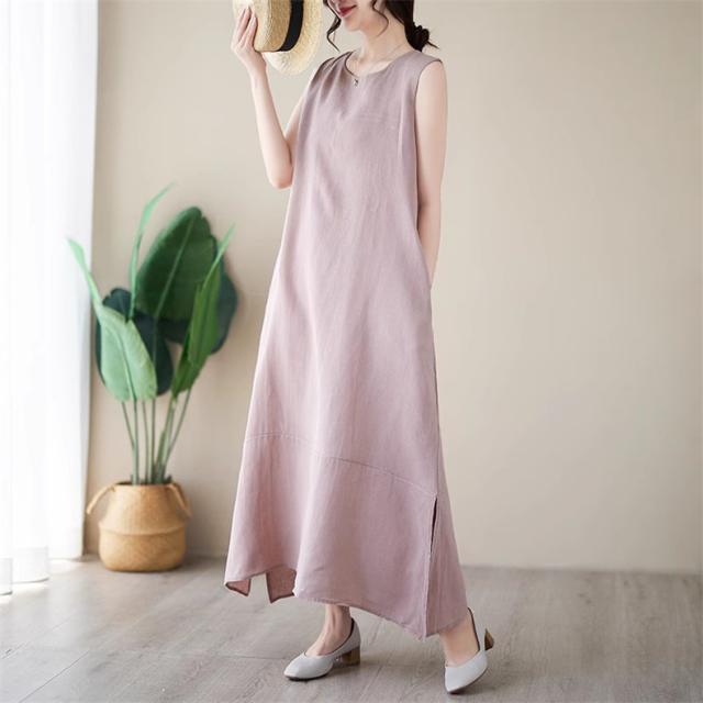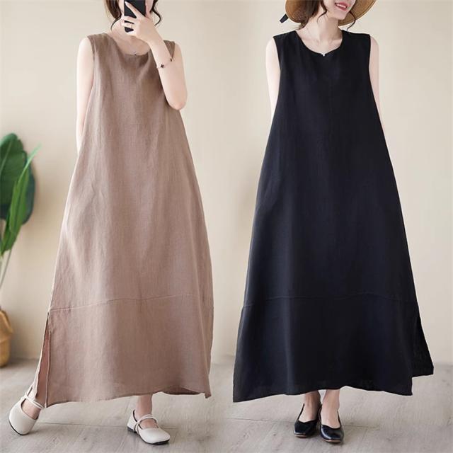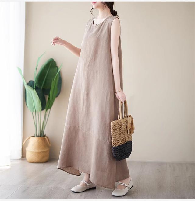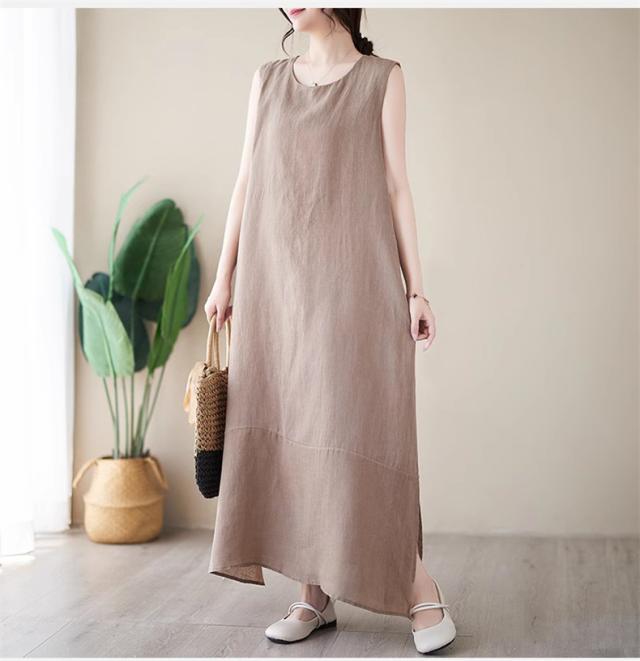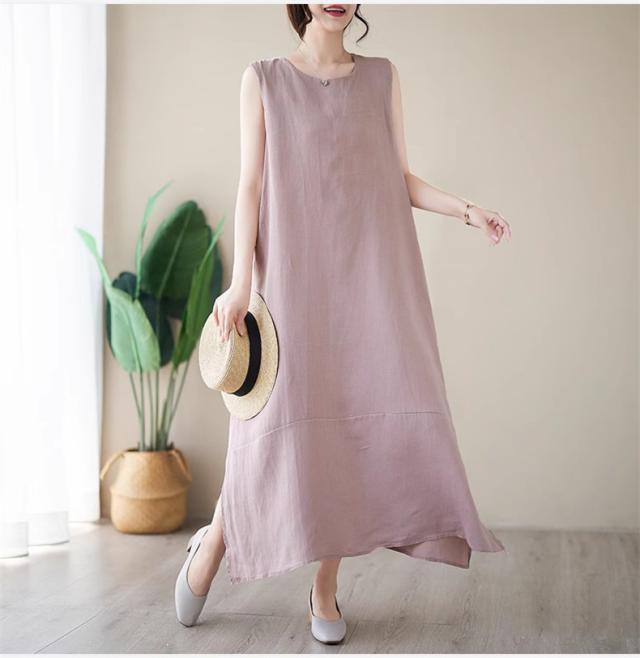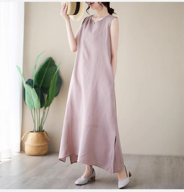 ワンピース レディース 夏ワンピ ロング丈 ノースリーブ クルーネック マキシワンピース ボディライン拾わず着られる レディライクな着こなし お洒落