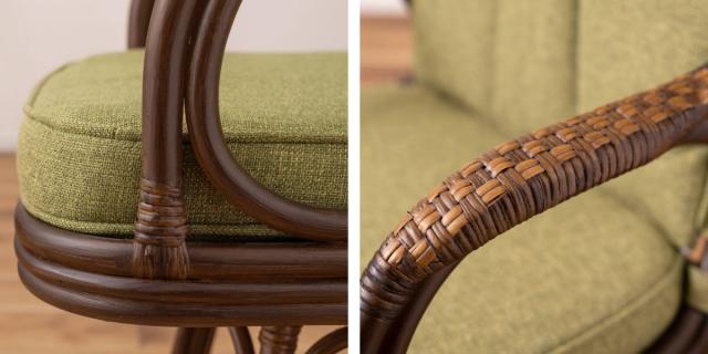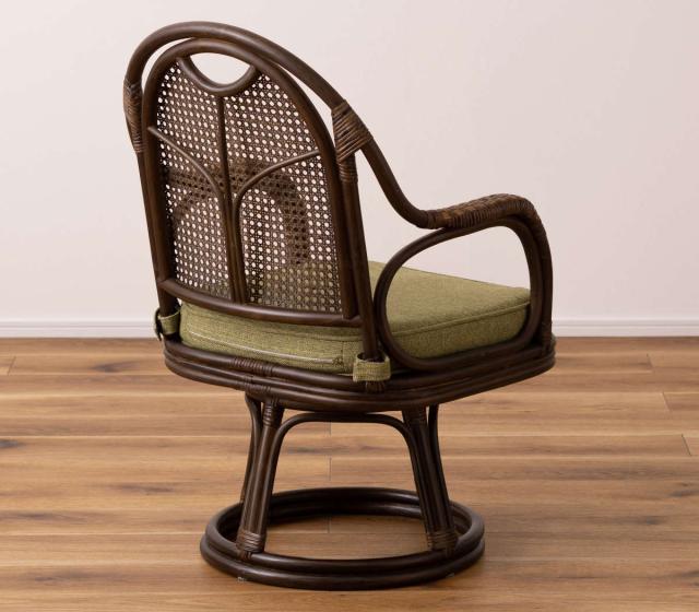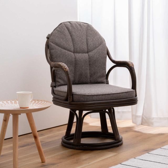 天然ラタンのしなやかな曲線を活かした回転チェアです。天然素材の豊かな風合いとアースカラーのクッションは、和室に置いても洋室に置いても違和感がなく、優しい雰囲気を作り出してくれます。