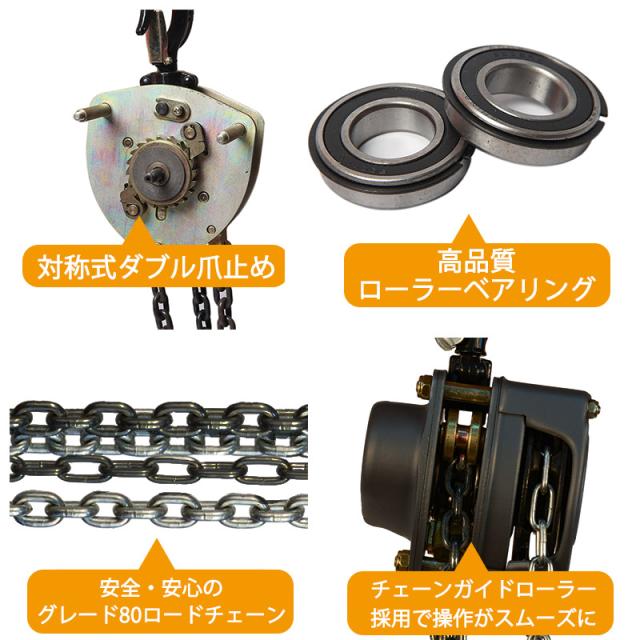 吊り上げ用ロードチェーンは国際基準ISOの規定をクリアしたT級グレード80を採用。