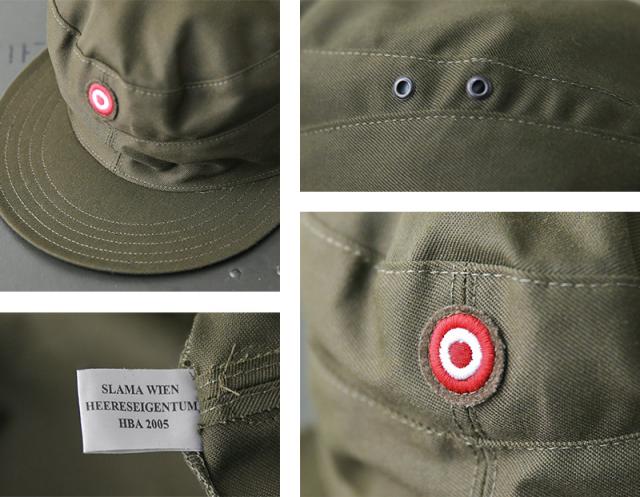 オーストリア軍実物放のラウンデルロゴが目を惹くフィールドキャップです。クラウン部分は、屋内などでの「帽子なし敬礼」の場に行くときに、キャップを折りたたんでジャケットのポケットに収納できるように考えられた、芯がなくサラッとしたツイル生地の一枚仕立て。 サイドにはアイレットがあり蒸れを防ぐ通気性にも考慮されていて、暑い日でも爽やかな被り心地を実現します。フロント中央には、オーストリアの赤と白の国旗を表すラウンデル紋章の刺繍がワンポイントになっています。