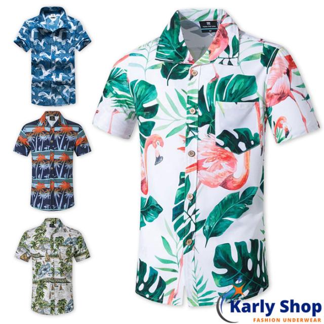 アロハシャツ メンズ 半袖 トップス 大きいサイズ ビッグサイズ 細身 開襟シャツ おしゃれ ハワイアン リゾート 制服 ボタニカル 胸ポケット 涼しい 男性用 夏 海 プール ヤシの木 パームツリー フラミンゴ かもめ 白 青 緑 ネイビー M L LL 3L 4L 5L 6L st906