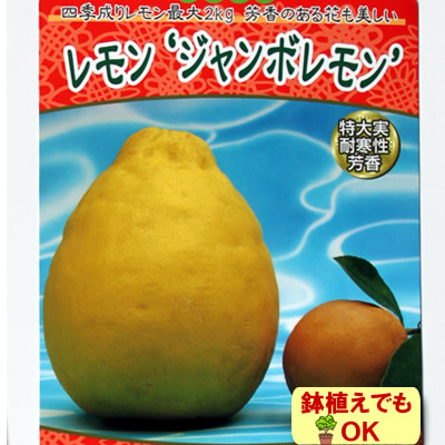 ジャンボレモンはたっぷり果汁が絞れる巨大なレモンの品種です。 (最大2kgにもなることも) 栽培しやすい品種ですが寒さにはやや弱く温暖な気候に向いています。 自家結実性があるので1本で実が成ります。