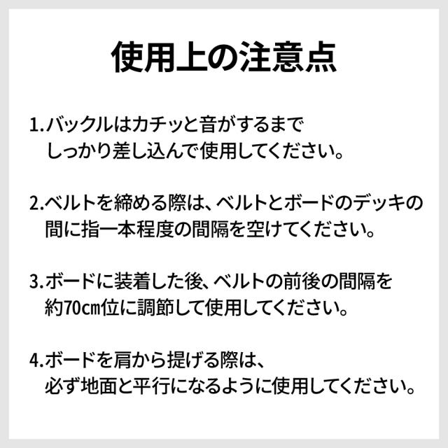3.ボードに装着した後、ベルトの前後の間隔を約70cm位に調節して使用してください。