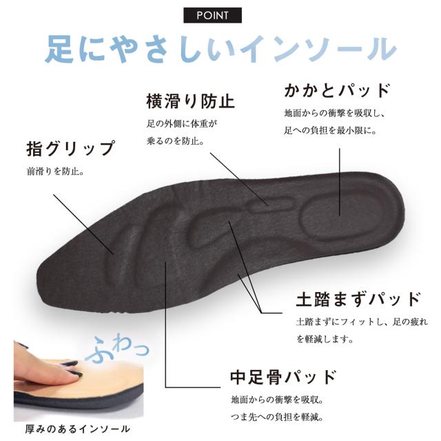 ■高機能インソール疲労や痛みの軽減が期待できる、ふわふわのやわらかインソールを使用。