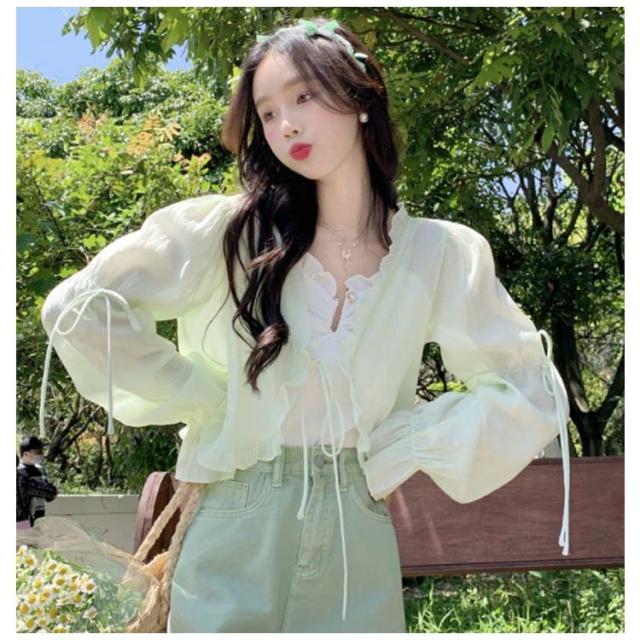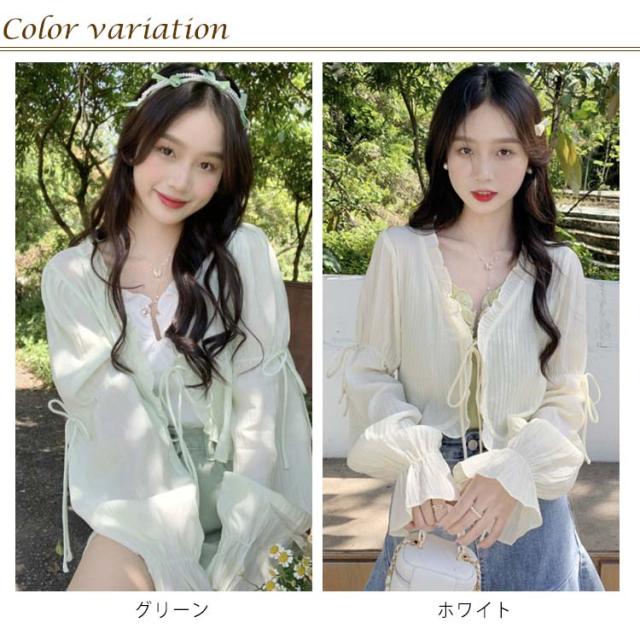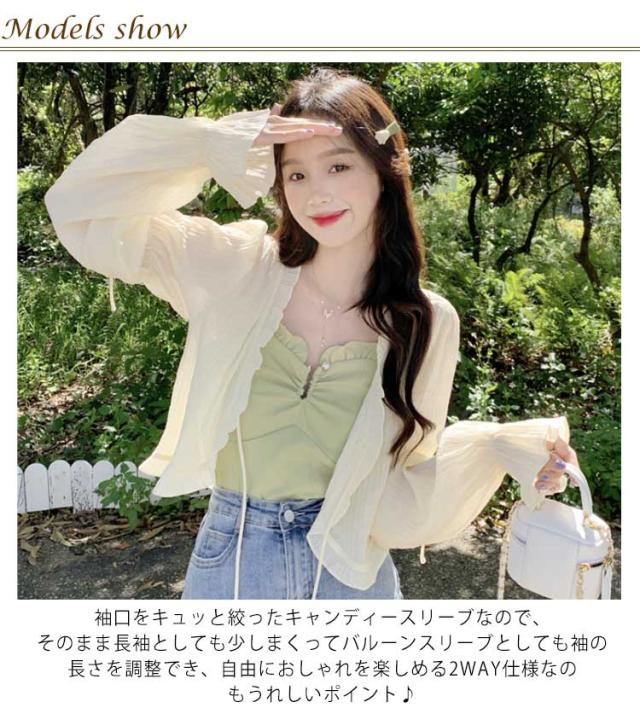 シアーカーディガン カーディガン 送料無料 ドビーストライプ クロップド丈 ショートカーデ ブラウス ロングスリーブ サマーカーディガン 長袖 フリル バルーンスリーブ 紫外線対策 冷房対策 春夏 お出かけ 可愛い 20代 30代
