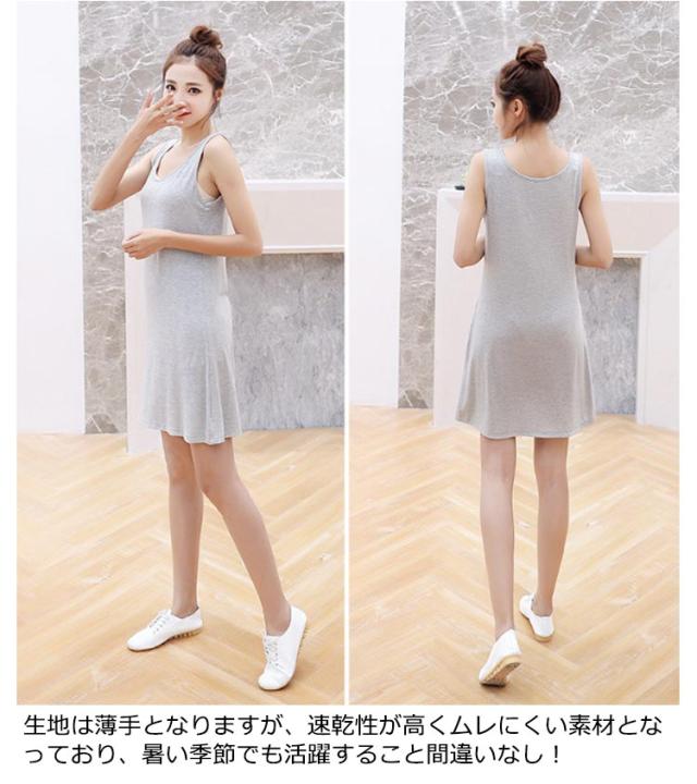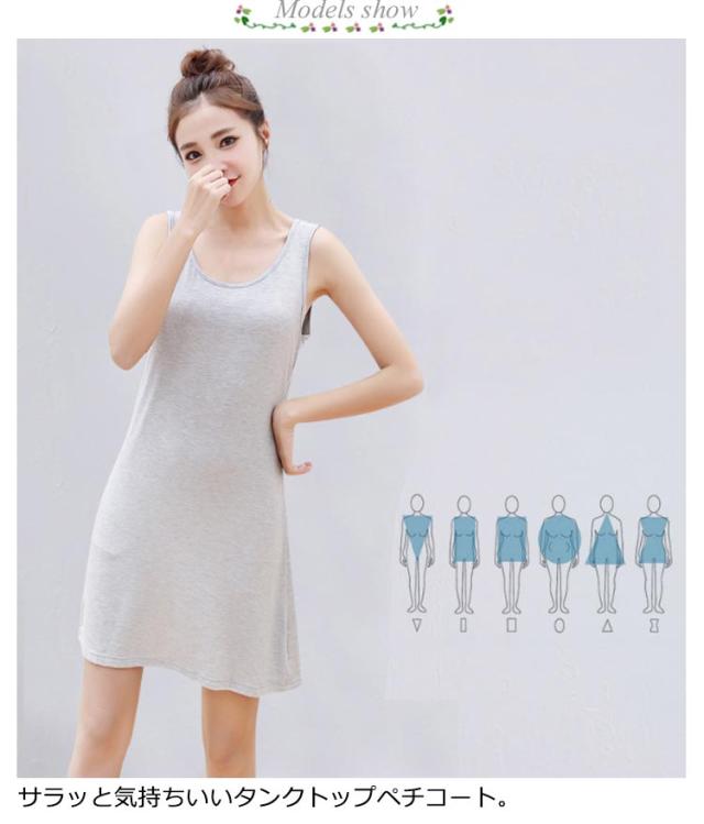 | ワンピースやスカートなどの透け防止に♪ サラッと気持ちいいタンクトップペチコート。 生地は薄手となりますが、速乾性が高くムレにくい素材となっており、暑い季節でも活躍すること間違いなし! やや広がるAラインシルエット、部屋着やルームワンピースとしても可愛く着こなせる。 | |