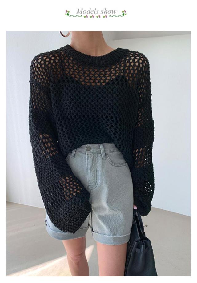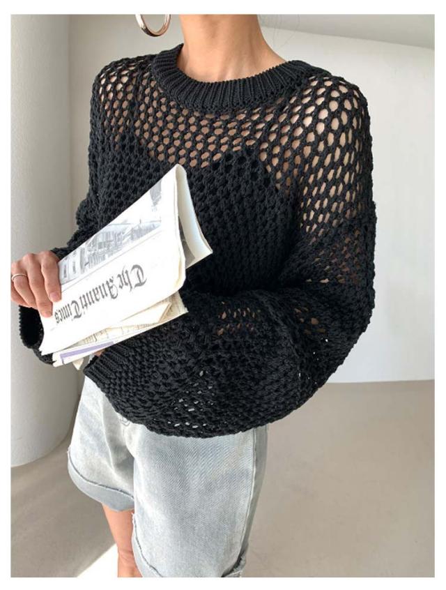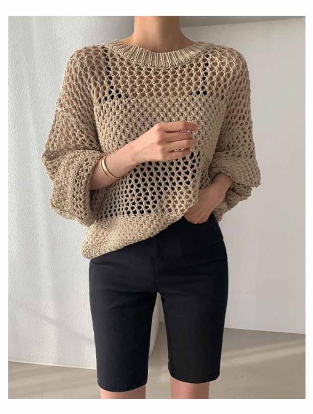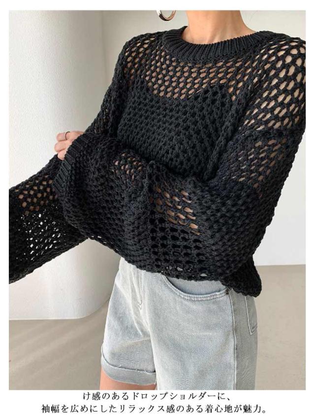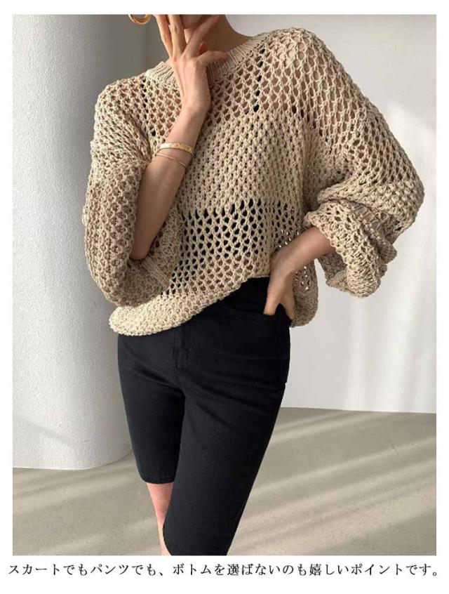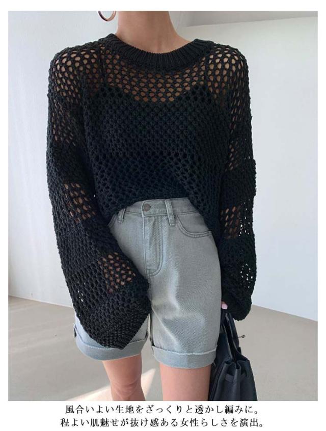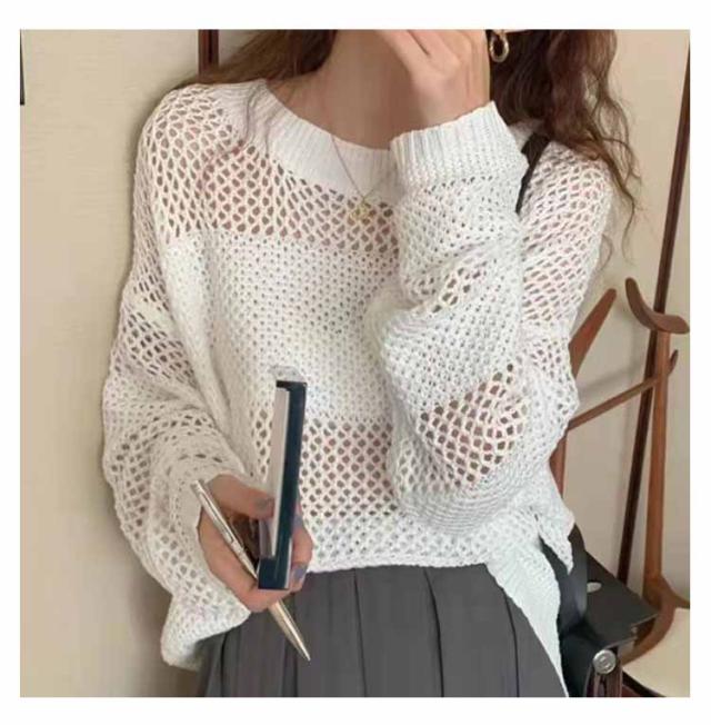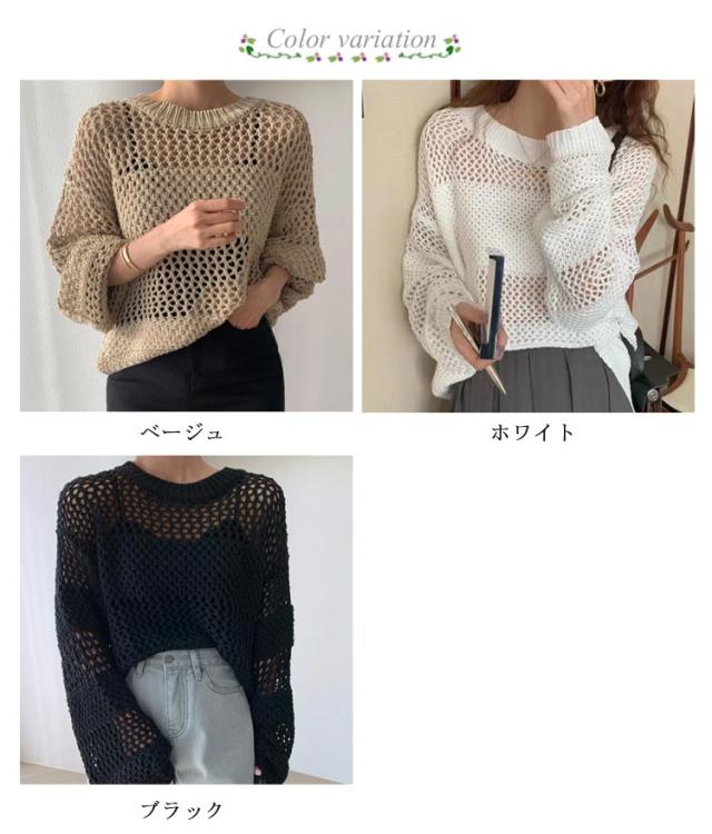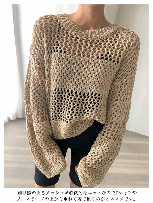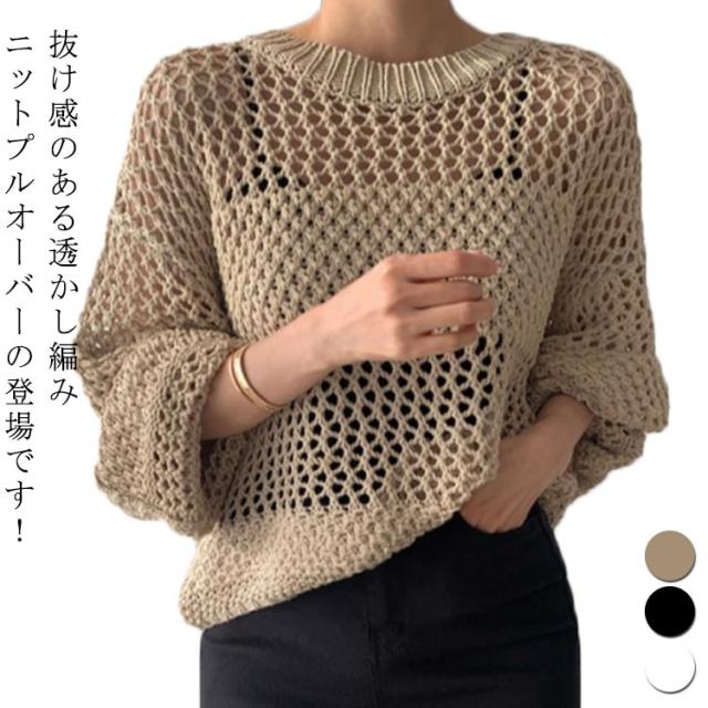 透かし編み ニット プルオーバー レディース サマーニット トップス 長袖 透け感 メッシュニット 春夏 クルーネック ゆったり シアー ニットセーター サマーセーター 肌見せ きれいめ カジュアル 無地 薄手 涼しい レイヤード 重ね着 UV対策 冷房対策 送料無料
