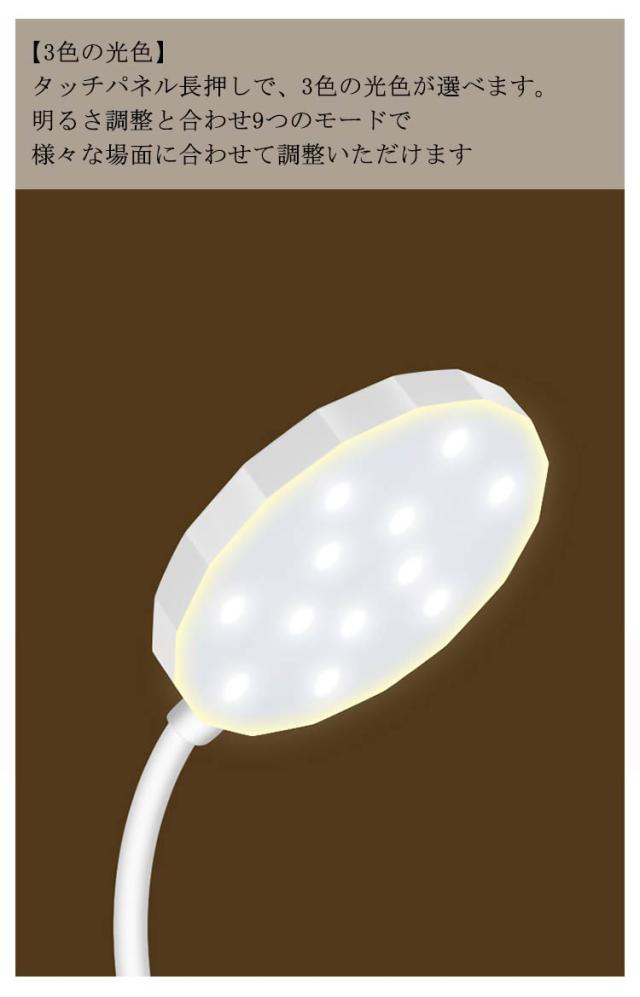 | 【クリップ式LEDライト】クリップ式のため、ベットや机、本棚など場所を選ばず使えます。 【使用用途】パソコンライト 学習用 在宅ワーク用 撮影用 倉庫用 在宅会議用 寝室用 ネイルライト用 二段ベッド用 【充電式デスクライト】USB充電式なのでどこでも持ち運べて便利。屋外の倉庫やアウトドアでも大活躍です。 【3段階調整】タッチパネルを軽く触れると、3段階で明るさを調整できます。 ベッドライトや勉強用、読書灯としてお好みの明るさを選べます。 【3色の光色】タッチパネル長押しで、3色の光色が選べます。明るさ調整と合わせ9つのモードで様々な場面に合わせて調整いただけます 【子供にも目に優しい光】ラウンドパネル光源で目に負担がかかりにくいです。目に優しいから学習机用としてもご利用いただけます。 【360°角度調整可能】自由に曲がれるアームにより高さや角度の調整が可能。 【多種類USB充電方式】台座の後ろにUSBポートを搭載。PC、、充電プラグ等から使用できます。 【使用箇所】シンプルなデザインは洋室 和室を選びません。リビングや勉強部屋以外にも洗面所やドレッサーにも。コードレスだから、屋外の倉庫照明やアウトドア キャンプにもご使用いただけます。 | |