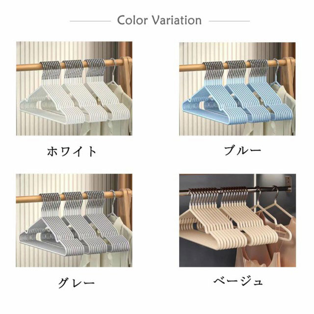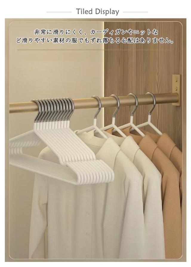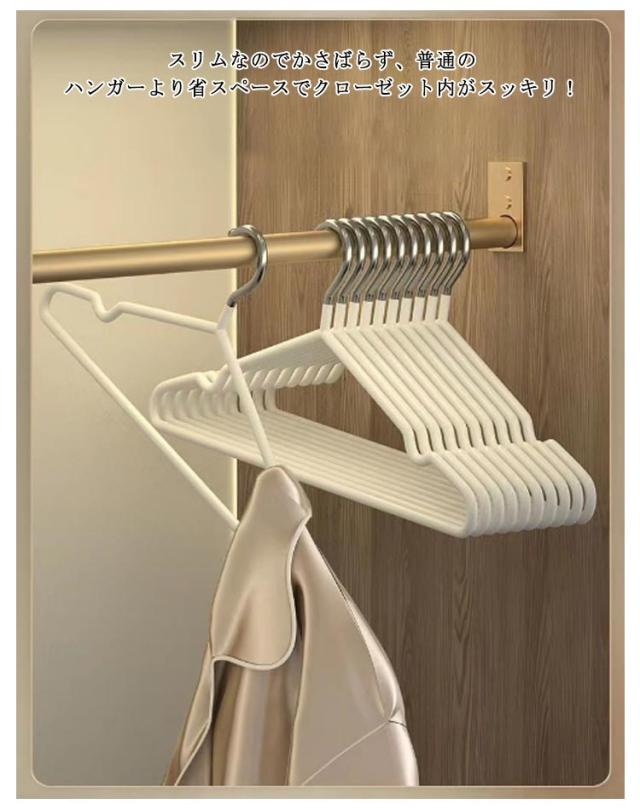 | 完全滑り止め!省スペースなPVC滑り止めハンガー 表面に特殊なPVCコーディング加工で衣類をしっかりキャッチ! 非常に滑りにくく、カーディガンやニットなど滑りやすい素材の服でもずれ落ちる心配はありません。 ハンガーの先に凹みがあるため、キャミワンピなどの肩紐が付いているお洋服も掛けることができます。 緩やかなカーブは肩の部分を引っ張ることなく掛けられるのでハンガーの跡が付きにくく、型崩れを防ぎます。 スリムなのでかさばらず、普通のハンガーより省スペースでクローゼット内がスッキリ! 耐水性があって、錆に強く、乾湿両用として洗濯からクローゼット収納まで一貫して使えます♪ | |