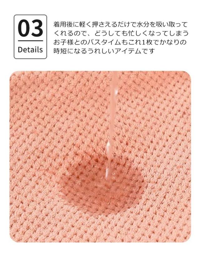 | お風呂から上がって体を拭かずにサッと着るだけ! 大人気の吸水速乾タオルの素材で作った半袖バスローブ。 ふわふわのとろけるような柔らかな風合いと可愛いデザインが特徴。 着用後に軽く押さえるだけで水分を吸い取ってくれるので、どうしても忙しくなってしまうお子様とのバスタイムもこれ1枚でかなりの時短になるうれしいアイテムです。 バスローブではなくルームウェアや部屋着、パジャマとしてももちろんお使いいただけます♪ 素材やデザインは季節関係なくオールシーズンお使いいただけます。 出産祝いやプレママへのプレゼントまた入院中の方へのお見舞い、腕が上げづらいかたにも大変喜ばれるお品です。 | |