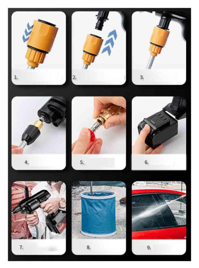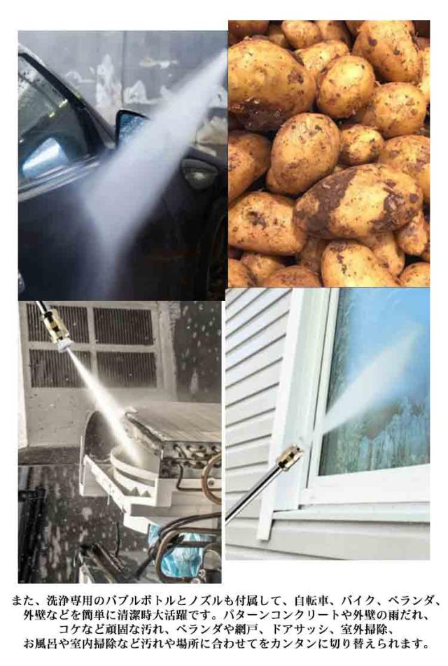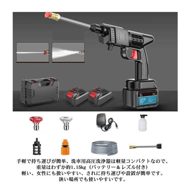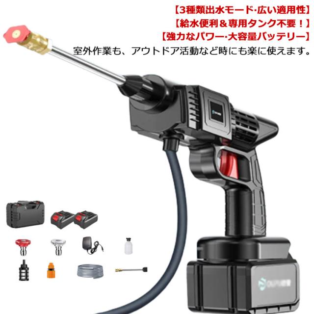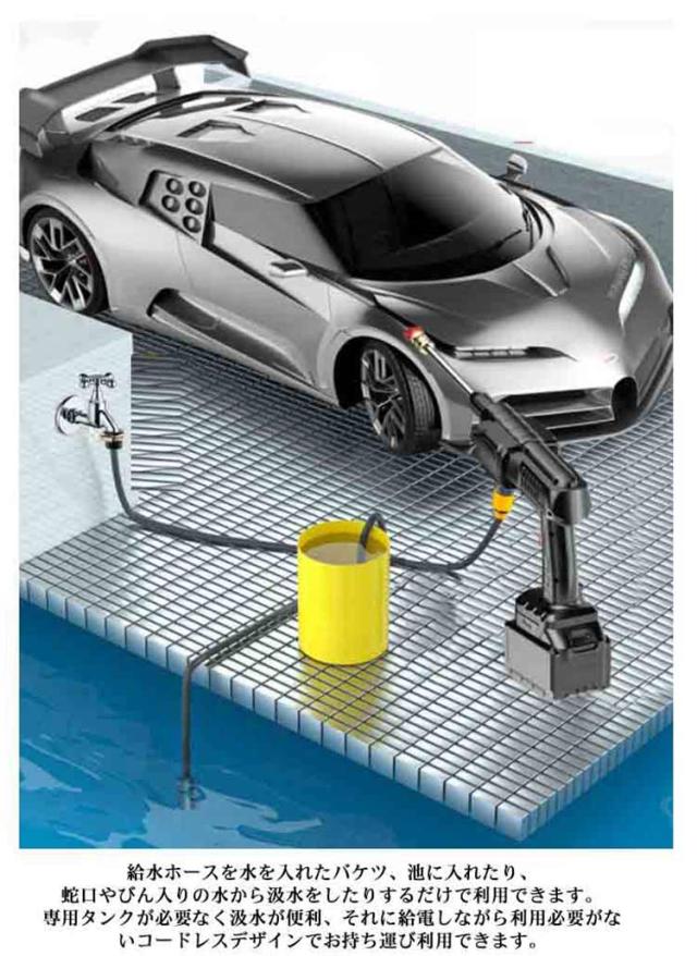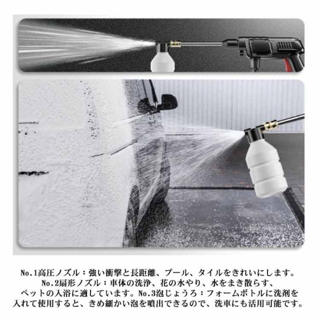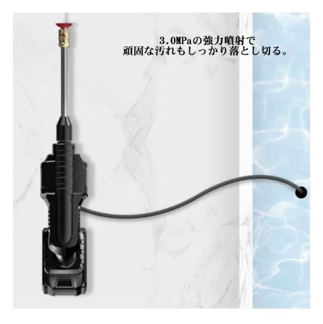 | 【3種類出水モード?広い適用性】 No.1高圧ノズル:強い衝撃と長距離、プール、タイルをきれいにします。No.2扇形ノズル:車体の洗浄、花の水やり、水をまき散らす、ペットの入浴に適しています。No.3泡じょうろ:フォームボトルに洗剤を入れて使用すると、きめ細かい泡を噴出できるので、洗車にも活用可能です。 また、洗浄専用のバブルボトルとノズルも付属して、自転車、バイク、ベランダ、外壁などを簡単に清潔時大活躍です。パターンコンクリートや外壁の雨だれ、コケなど頑固な汚れ、ベランダや網戸、ドアサッシ、室外掃除、お風呂や室内掃除など汚れや場所に合わせてをカンタンに切り替えられます。 【給水便利&専用タンク不要!】 給水ホースを水を入れたバケツ、池に入れたり、蛇口やびん入りの水から汲水をしたりするだけで利用できます。◆専用タンクが必要なく汲水が便利、それに給電しながら利用必要がないコードレスデザインでお持ち運び利用できます。室外作業も、アウトドア活動など時にも楽に使えます。 手軽で持ち運びが簡単、洗車用高圧洗浄器は軽量コンパクトなので、重量はわずか約1.15kg(バッテリー&レズル付き)軽い、女性にも扱いやすい、されに持ち運びや設置が簡単です。狭い場所でも使いやすいです。 【強力なパワー?大容量バッテリー】 弊社の高圧洗浄機ガンは大型純銅モーターを本体内部に搭載。大容量バッテリーで、60分間の連続使用が可能で、頻繁に充電する手間がなく、安心して使用することができます。3.0MPaの強力噴射で頑固な汚れもしっかり落とし切る。(*使い環境など要因より異なる可能性があります)。本体や各種アタッチメントを収納できる、専用のケースも付属しています。使わないときにスッキリと収納できるばかりでなく、ケースごと持ち運びも可能です。 | |