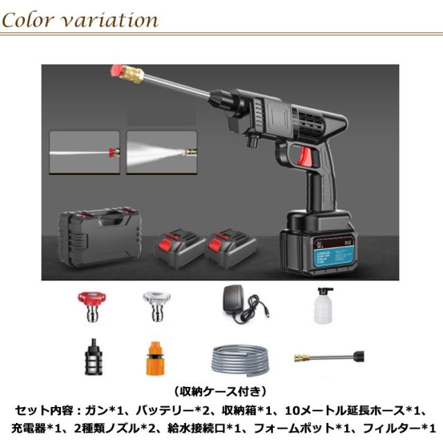 | サイズについての説明 | セット内容:ガン*1、バッテリー*2、収納箱*1、10メートル延長ホース*1、充電器*1、2種類ノズル*2、給水接続口*1、フォームポット*1、フィルター*1 |