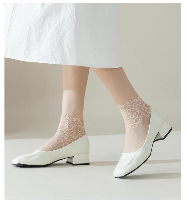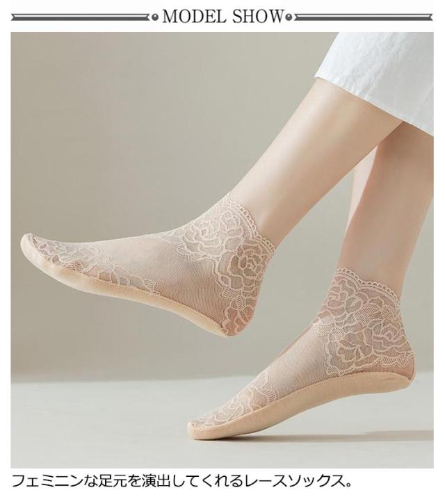 | 【5足セット】 【花柄シースルレースで透け感が楽しめるおしゃれ】 フェミニンな足元を演出してくれるレースソックス。 パンプスやローファーなど様々なシューズにマッチできるおしゃれな靴下。 伸縮性のあるレースで程よくフィットし、脱げない。 底面は綿素材で、通気性よく、滑りにくいから履き心地がGOOD! | |