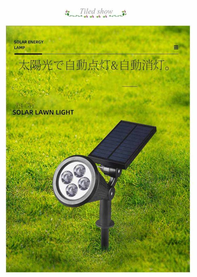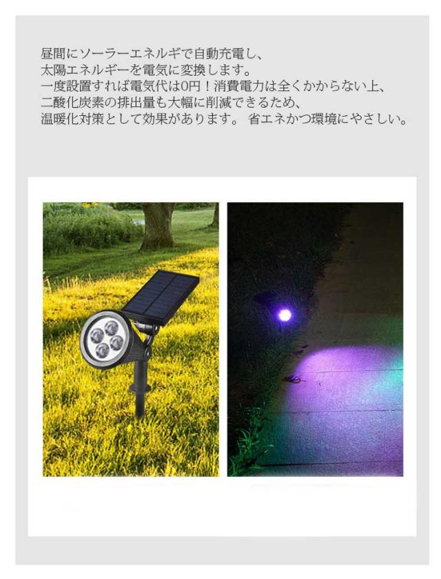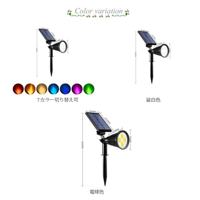 | 電池不要のソーラーパネルを搭載し、電気代0 円を実現しました!ガーデンライト 4本セット 太陽光で自動点灯&自動消灯。ソーラーパネルで直射日光の光を吸収し自動蓄電、 夜になると自動で点灯。 また、太陽の光を浴びると自動消灯します。 昼間にソーラーエネルギで自動充電し、太陽エネルギーを電気に変換します。一度設置すれば電気代は0円!消費電力は全くかからない上、二酸化炭素の排出量も大幅に削減できるため、温暖化対策として効果があります。 省エネかつ環境にやさしい。 IP65*対応の防水仕様!IP65の高防水性を持っているので天候が悪い日等、気にせずに使用できます。 2Wayで簡単設置!地面に差し込むだけの地面差し込み式とネジで取り付ける壁掛けの2通りの設置が可能。差し込み式/壁掛け式 スイッチ:長押し点灯 1.暗くなると自動的に明るい色が自動的に切り替わる 2.暗くなると自動的に明るくなる色は変わらない 長押しオフ | |