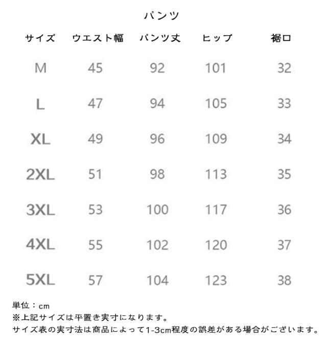 | サイズ | M(上下セット) L(上下セット) XL(上下セット) 2XL(上下セット) 3XL(上下セット) 4XL(上下セット) 5XL(上下セット) |