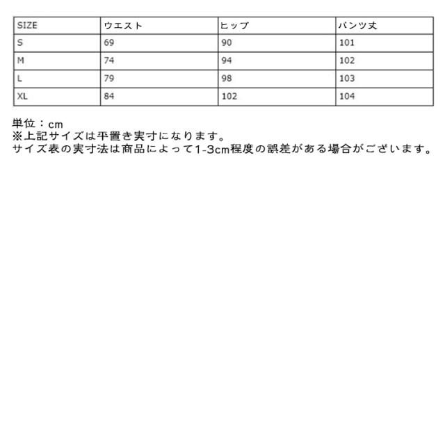 | サイズについての説明 | 【S】ウエスト70-96 ヒップ90 パンツ丈101 【M】ウエスト74-100 ヒップ94 パンツ丈102 【L】ウエスト78-104 ヒップ98 パンツ丈103 【XL】ウエスト82-108 ヒップ102 パンツ丈104 【2XL】ウエスト86-112 ヒップ106 パンツ丈105 ※上記サイズは平置き実寸になります。サイズ表の実寸法は商品によって1-3cm程度の誤差がある場合がございます。 |