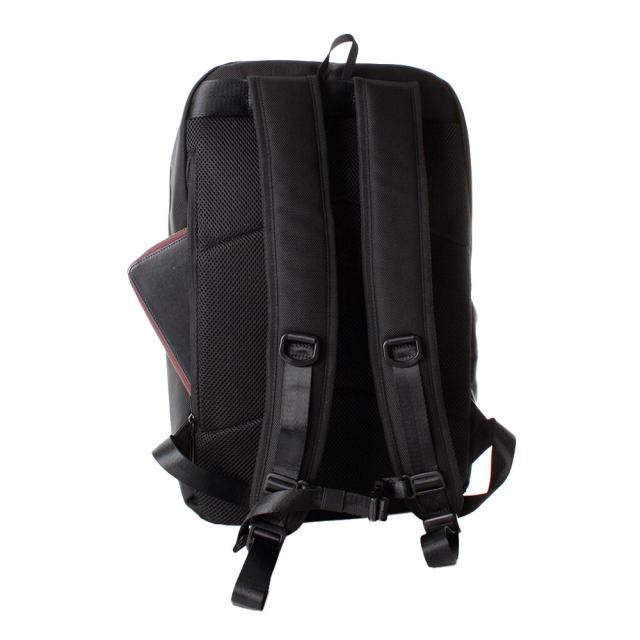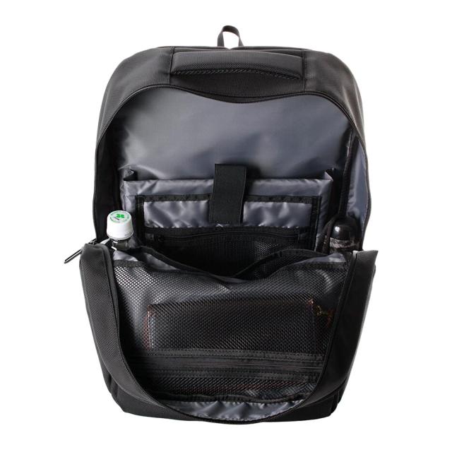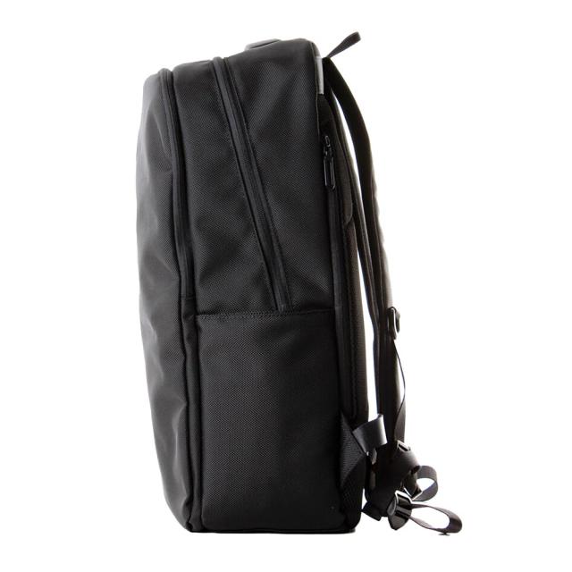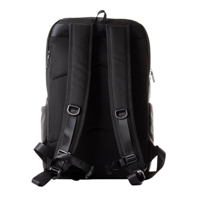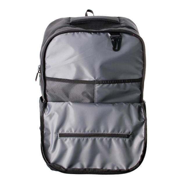 軽量撥水頑丈な1680Dのナイロン素材感を生かしたシンプルなデザインに、使いやすさにこだわった機能性を付けました。前面のポケット部分内装にはオープンポケット×1、メッシュポケット×1、ファスナーポケット×1が搭載されており、また上部のナスカンは家の鍵や、交通系ICカードなどをぶら下げておくのに便利です。上部持ち手にはしっかりとした厚みのあるウレタン素材を使用した幅4.5cmの持ち手がついており、しっかりとしているなかで、内側にはメッシュもあり柔らかくて持ち心地はとても良いです。メイン収納部には、視認性の高いメッシュポケット×4、オープンポケット×1、パソコンポケット×1、タブレットポケット×1各種タブレットや、ノートパソコンも入る十分な収納力がございます。ノートPC周辺機器収納にも内装のポケットが役立ちます。両サイドのポケットにはペットボトルや折り畳み傘を入れていただけます。背面部にも長財布の入る背面ファスナーポケットがありますので、前持ちするときも簡単に取り出していただくことが出来ます。歩いているときに肩ベルトがずれてくるのを防止するチェストベルトも搭載。肩ベルトの長さ変更も簡単にしていただける様にテープ先に指を入れやすい工夫が施されています。通年通してご利用いただける大容量多機能リュックを是非ご覧くださいませ。