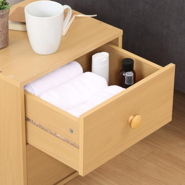 2杯の引出しは、それぞれ約幅28.5×奥行23×深さ13cmと、日用品や化粧小物などの細かな雑貨の収納にちょうど良い大きさです。