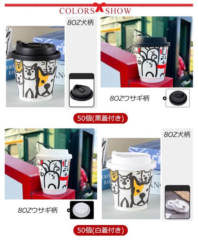 50個 耐熱紙コップ 蓋付き 8オンス 250ml 使い捨て 厚い 厚紙 二重断熱紙コップ 犬柄 ウサギ柄 かわいい おしゃれ 二重構造 紙コップ 業務用 テイクアウト クラフト ペーパー カップ コーヒー お茶 耐熱 ホットドリンク 高級感 アニマル柄