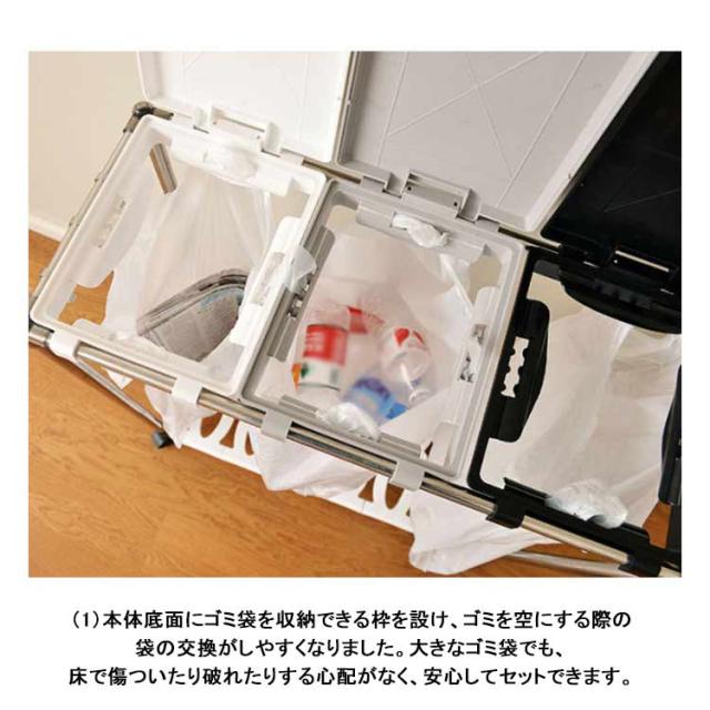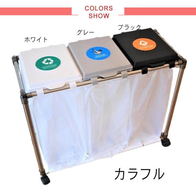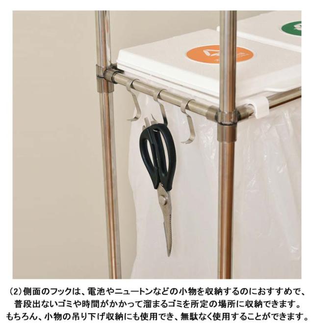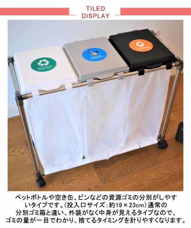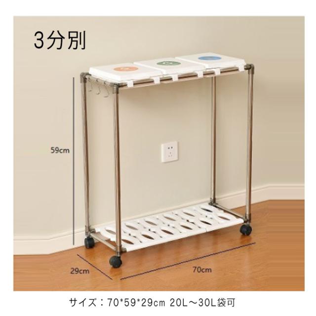 | 【3分別ゴミ袋ホルダー】ペットボトルや空き缶、ビンなどの資源ゴミの分別がしやすいタイプです。(投入口サイズ:約19×23cm)通常の分別ゴミ箱と違い、外装がなく中身が見えるタイプなので、ゴミの量が一目でわかり、捨てるタイミングを計りやすくなります。分別用シール付きで、誰が見ても分かりやすく、分別しやすいごみ箱です。 【5分完成!かんたん組み立て】アッパーパネルとロアパネルは完成品でお届けします。ネジを使わないので、5分で完成します!各パーツをはめ込んで組み立てるだけです。ゴミ袋の装着も簡単:ゴミ袋を挟み込み、フタの内側のスナップで留めるだけでセット完了です。 【重要】スナップを留める際は、パイプではなく、フタの外側の縁を持つようにしてください。 【総容量30L×3・袋満載まで入れられる】合計90Lの大容量ながら3分別のゴミ袋スタンド 。箱と違ってビニール袋の柔軟性を利用できて沢山はいります。プラスチック、缶・ビン・ペットボトルなど、色々な種類のゴミ箱を置く必要無し、1台だけでスッキリ分別が可能です。本製品は、一般家庭用の20〜30L用ゴミ袋最適な分別ゴミ箱です。 【安定感のあるステンレス製パイプ】ごみ袋ホルダーは直径2cmのステンレス製パイプでしっかり支え、錆びにくい特徴もあります。分別ダストワゴの底部にスイスイ動くキャスターが付き、お掃除の際の移動もスムーズです。4脚にロック機能付きのキャスターで足元を固定してぐらつき防止できます。 【便利さにこだわった分別ゴミ箱】(1)本体底面にゴミ袋を収納できる枠を設け、ゴミを空にする際の袋の交換がしやすくなりました。大きなゴミ袋でも、床で傷ついたり破れたりする心配がなく、安心してセットできます。(2)側面のフックは、電池やニュートンなどの小物を収納するのにおすすめで、普段出ないゴミや時間がかかって溜まるゴミを所定の場所に収納できます。もちろん、小物の吊り下げ収納にも使用でき、無駄なく使用することができます。 | |