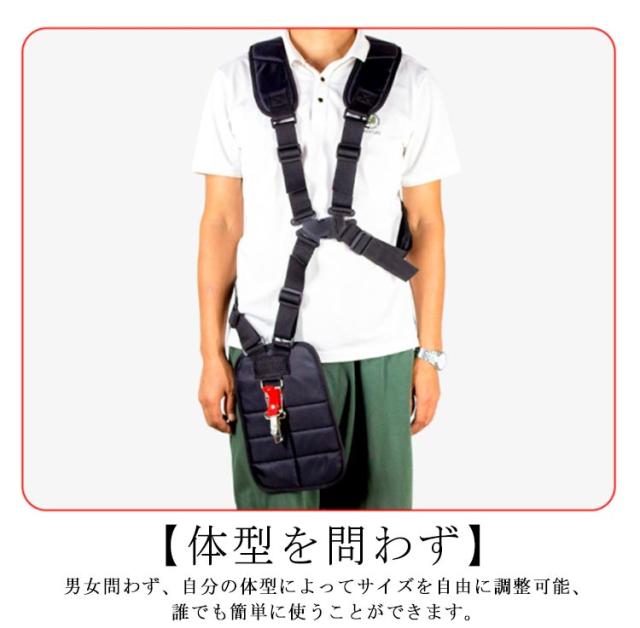 | 【安全設計】8mm厚めのパッドで衝撃をしっかり吸収し、草刈り機や刈払機の重さを分散し、機械の振動や熱から身体をガード! 【負担軽減】両肩式と腰当付きの設計により、機械の重さを体全体に分散し、腰痛持ちの方も楽に作業を行えます。 【体型を問わず】男女問わず、自分の体型によってサイズを自由に調整可能、誰でも簡単に使うことができます。 【快適なつけ心地】厚みのある両肩ベルトで食い込みを防止。 【使用簡単】肩掛け式なので、ワンタッチバックルで簡単に装着できます。使用簡単。 | |