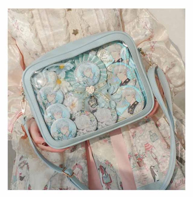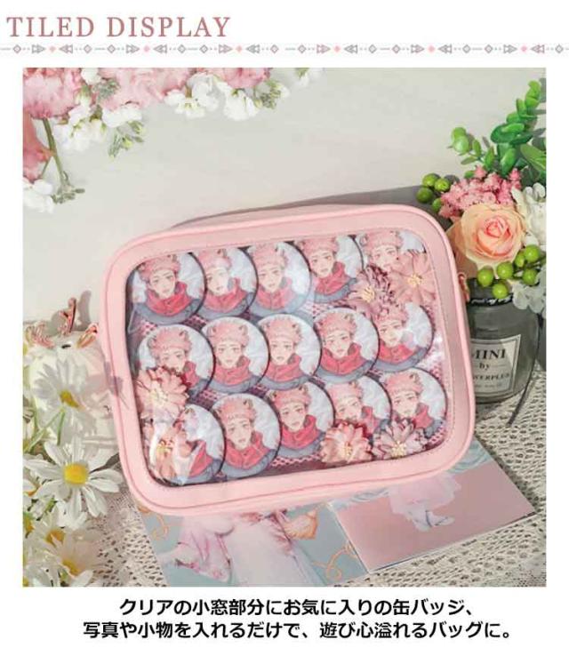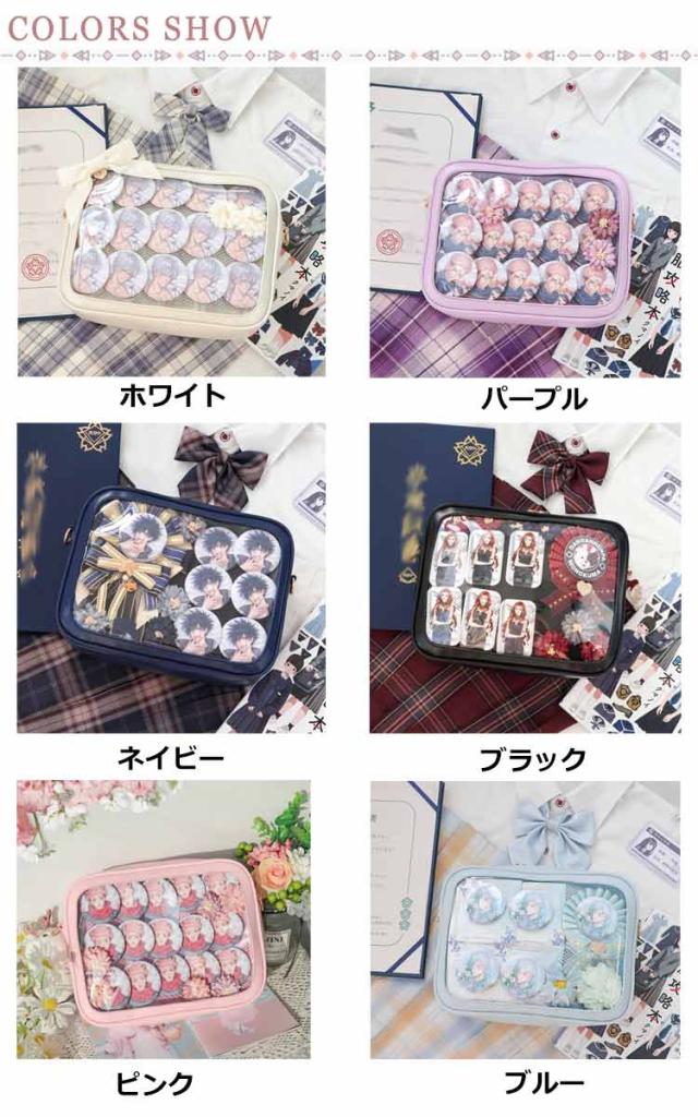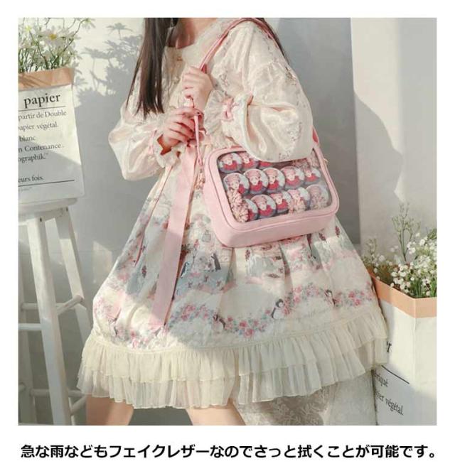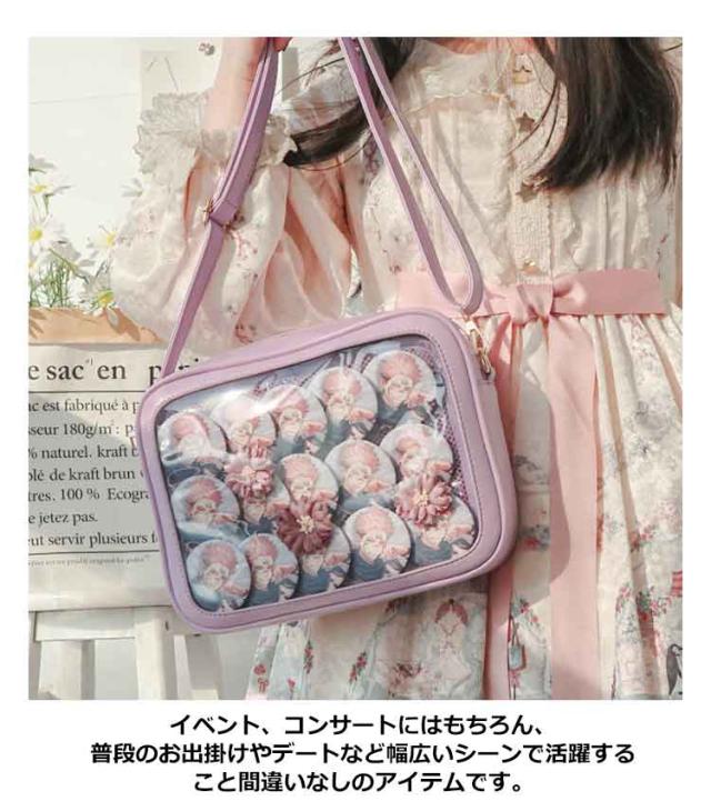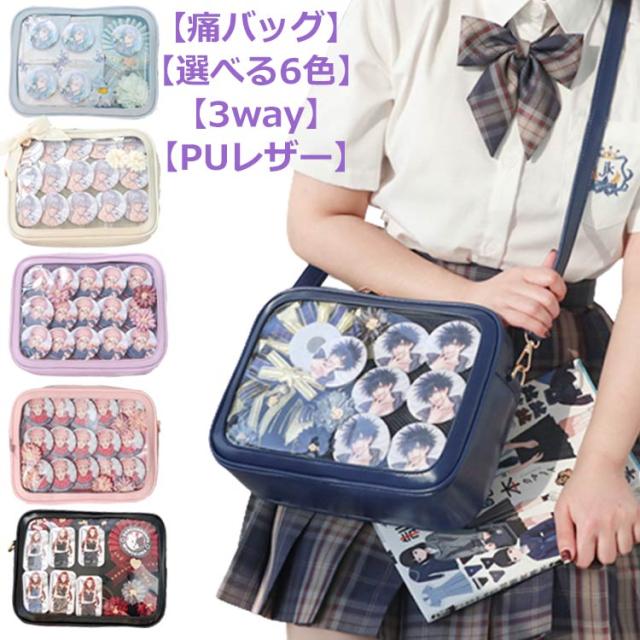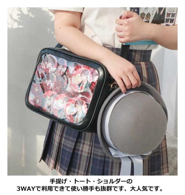 | 【痛バッグ】【選べる6色】【3way】【PUレザー】 クリアの小窓部分にお気に入りの缶バッジ、写真や小物を入れるだけで、遊び心溢れるバッグに。 フェイクレザーで上品な印象に。 急な雨などもフェイクレザーなのでさっと拭くことが可能です。 イベント、コンサートにはもちろん、普段のお出掛けやデートなど幅広いシーンで活躍すること間違いなしのアイテムです。 手提げ・トート・ショルダーの3WAYで利用できて使い勝手も抜群です、大人気です。 | |