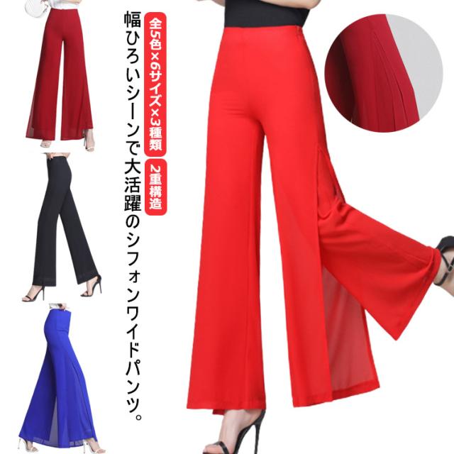 2重構造 ダンスパンツ ガウチョパンツ レディース ダンスウエア ロング丈 ハイウエストパンツ 長ズボン シフォン ワイドパンツ ロングパンツ ハイウエスト ボトムス 春 夏 秋 ダンス 大人 スリット入り 無地 大きサイズ 母の日 プレゼント ギフト 大きサイズ 送料無料
