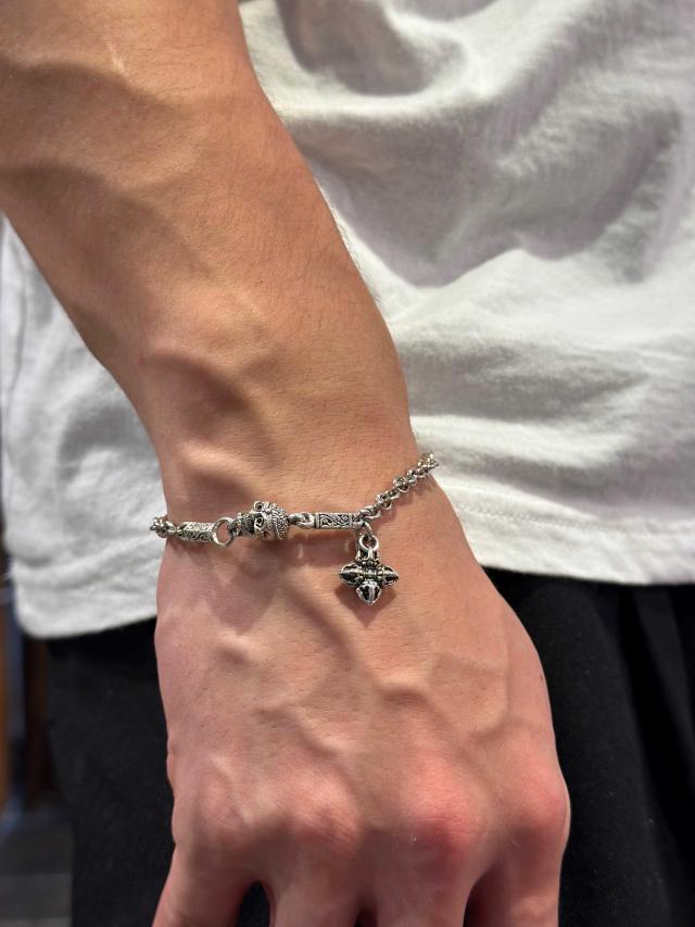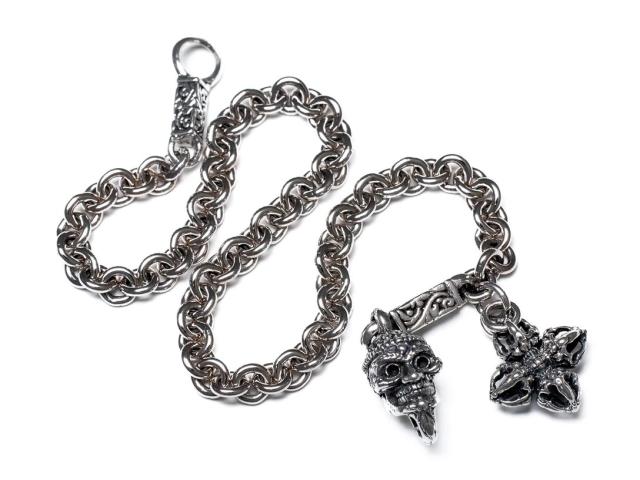 チベットに伝わる装身仏具のチベタン・モンク・スカルのチャームと仏教のお守りダブルドージェがセットされたZOCALOらしいシルバーブレスレット。