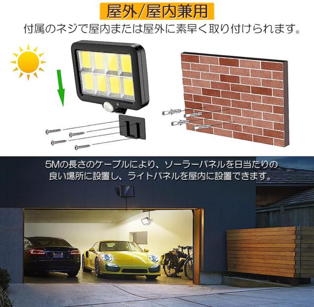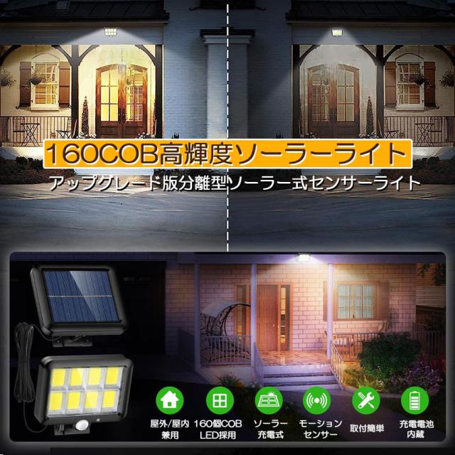 【分離式のソーラーパネル】従来のソーラーランプと比較して、ソーラーパネルをランプ本体から分離しています。付属の5m防水ケーブルを使用して、日当たりの良い場所にソーラーパネルを設置できます。日中は電力を節約し、夜は長くて明るい光を生成します。【160COBチップ採用】より明るいCOBのLEDソーラーライトにより、検出と照明角度は120°で、より広い照明エリアを覆うし、広い範囲で最大限に明るさを提供します。これにより、夜間でも通行人に明るく安全な環境が作り出されます。