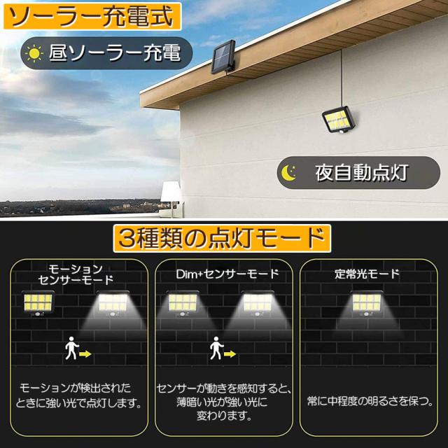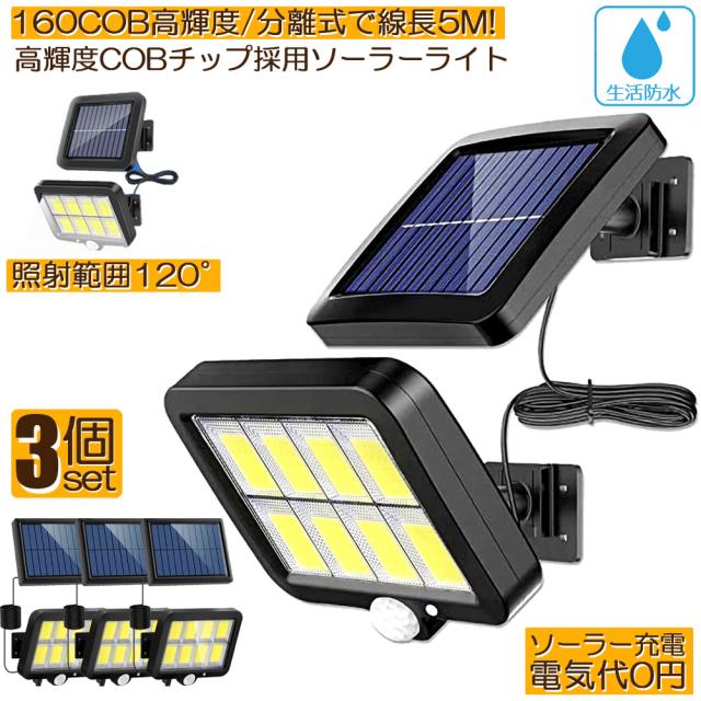ソーラーライト センサーライト 防犯ライト 3個セット 屋外 COBチップ採用 160COB 3モード 120° 照明範囲 ソーラーライトモーションディテクター 5Mケーブル付き 防水 自動点灯 屋外照明 庭 玄関 ガーデンライト 駐車場 停電緊急対策