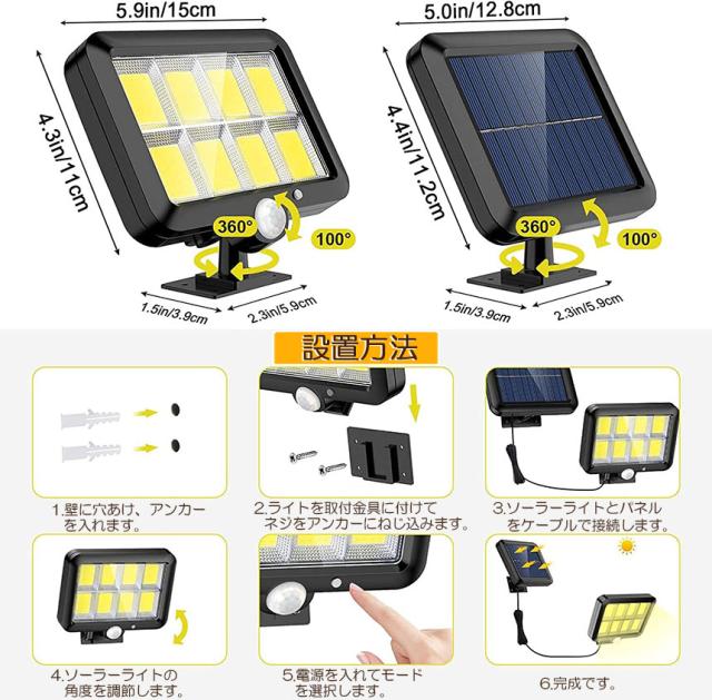 【160COBチップ採用】より明るいCOBのLEDソーラーライトにより、検出と照明角度は120°で、より広い照明エリアを覆うし、広い範囲で最大限に明るさを提供します。これにより、夜間でも通行人に明るく安全な環境が作り出されます。