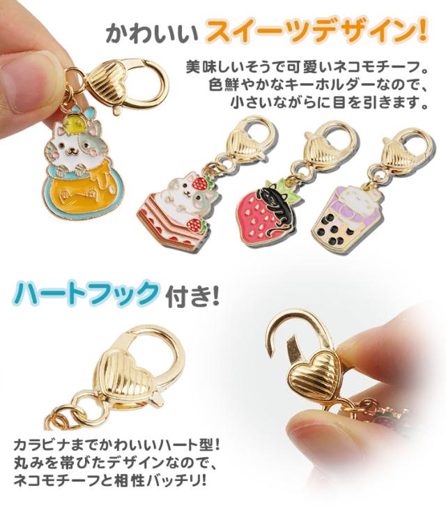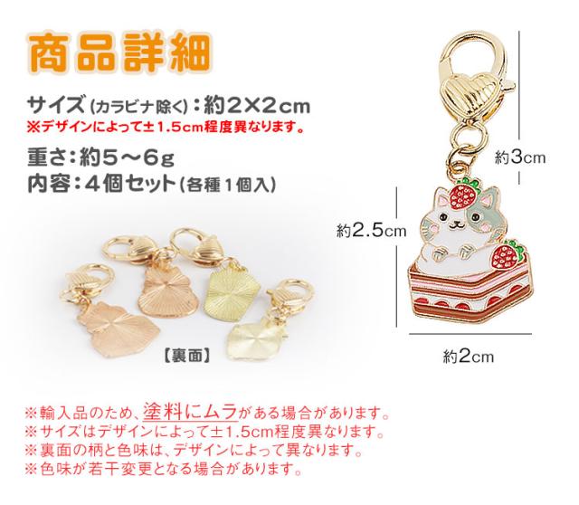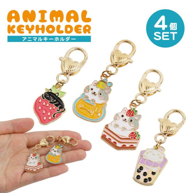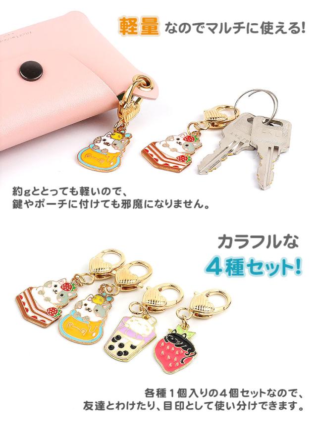 4個セット 各種1個入 チャーム 猫 キーホルダー かわいい カラビナ 小さい 苺 タピオカ ネコ キーホルダー
