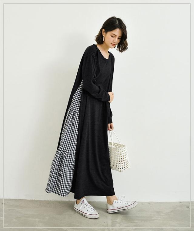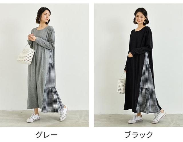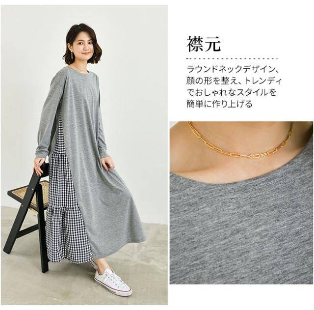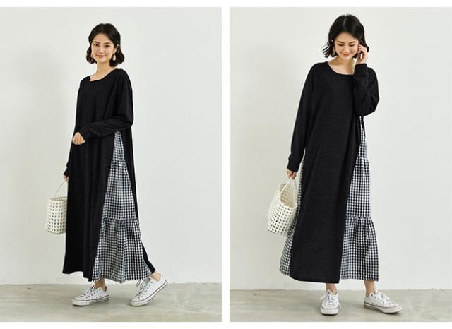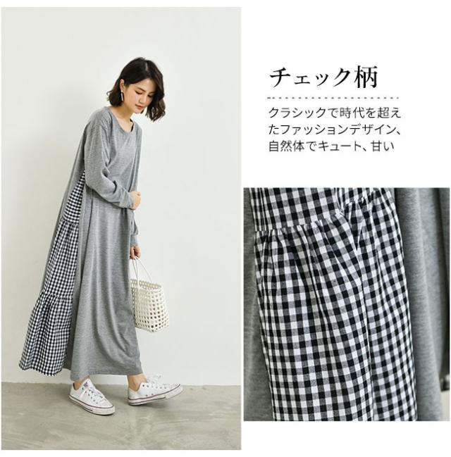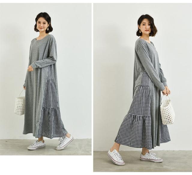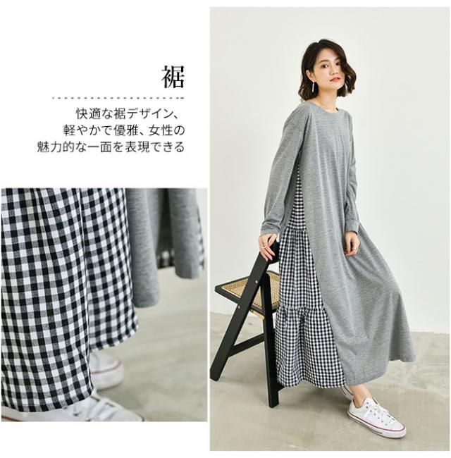 【即納 特別価格】ワンピース ゆったりワンピース ビッグスカート長袖 ロングスリーブ ロンTワンピース 体型カバー ワンピ ロング丈 女性用 グリッド柄 インナードレス ロング丈 スリム 大きいサイズ 冬