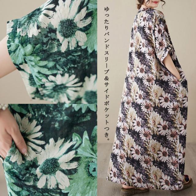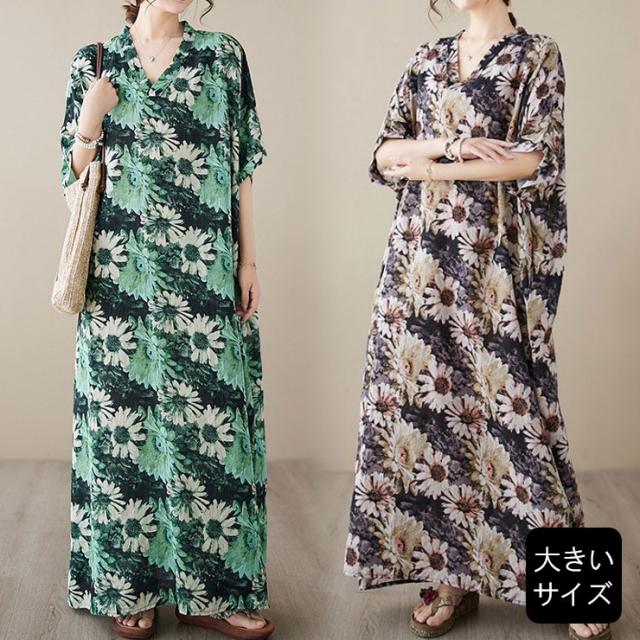 花柄ワンピ マキシワンピース レディース オーバーサイズ Vネック 大きいサイズ (75843)