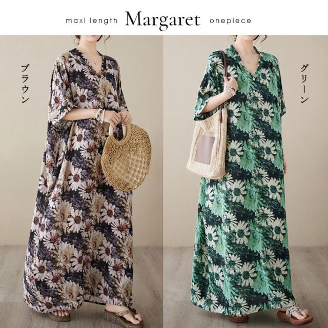 ★☆大きいサイズレディース 花柄ワンピース マキシワンピ オーバーサイズ Vネック LL 3L 4L 5L 6L ブラウン グリーン 30代 40代 50代☆★