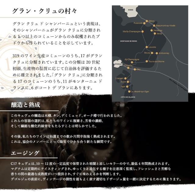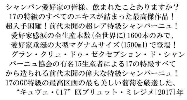 シャンパン愛好家の皆様、飲まれたことありますか?17の特級のすべてのエキスが詰まった最高傑作品!超入手困難!前代未聞の超レア特級シャンパーニュ! 愛好家感涙の全生産本数(全世界に)1600本のみで、 愛好家垂涎の大型マグナムサイズ(1500ml)で登場! グラン・クリュ・ドゥ・ゼクセプション・ド・シャンパーニュ協会の有名15生産者による17の特級すべてから造られる前代未聞の偉大な特級シャンパーニュ!17のGC特級の最高区画の最も美しい葡萄を厳選した、 “キュヴェ・C17”EXブリュット・ミレジメ[2017]年■さまざまなギフトアイテムをご用意しております。