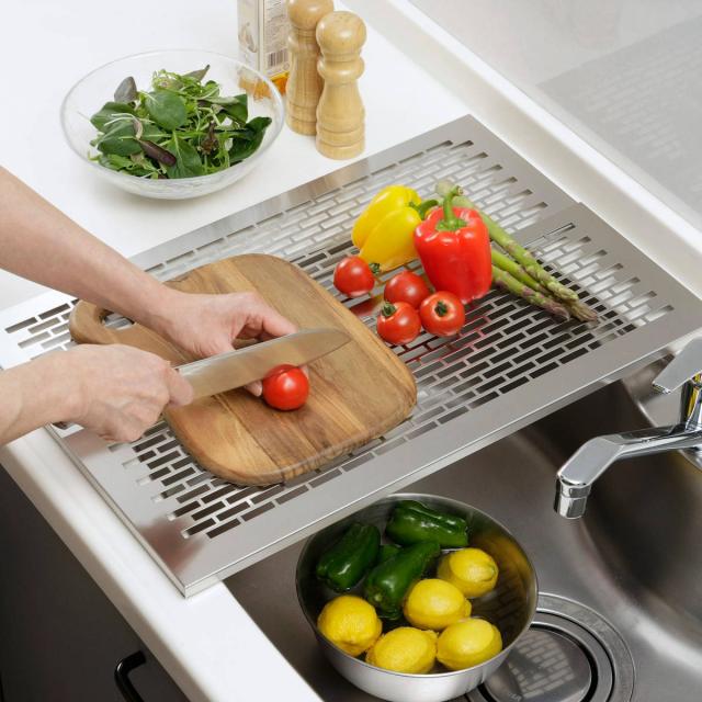 シンク上に設置するだけで作業のスペースを確保できる頑丈スライド作業台です。盛り付けをするのにお皿を並べるスペースが欲しい、洗い物の量が多いから水切スペースが欲しい、そんな時にシンクに設置すれば、簡単に作業台や水切りとして使用することができます。