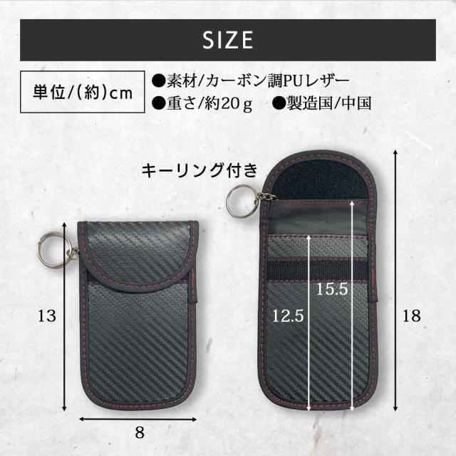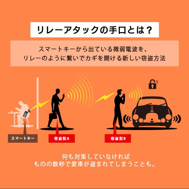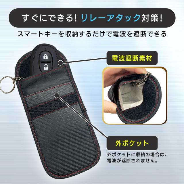 | 商品について | スマートキーのリレーアタックをブロックするスマートキーケースです。 リレーアタックとは、近年多くの車で採用されている「スマートキー」の仕組みを悪用して車を盗難する手口です。 このリレーアタック防止スマートキーケースは特殊な電波遮断生地により、 スマートキーから発信されている電波を遮断するので、このキーケースに入れて保管すればリレーアタックを未然に防げます。 車の鍵だけでなく、玄関のスマートキーやクレジットカードや銀行のキャッシュカードなどのスキミング防止としても使用可能です。 注意事項 | ・使用時の破損や事故等につきましては責任を負いかねます。 | ・輸入品の為、輸送の際に生じるキズ・汚れ・箱潰れがある場合がございますが新品です。 ・サイズ・重量は、多少の誤差が生じる場合がございます。 ・あくまで画像はイメージですので、商品改良の為パッケージや一部仕様が少し変更になる場合もございます。 ・お使いのブラウザや設定により、画像と実際の商品との若干の色の違いが生じる場合がございます。 ・会社概要・お買い物ガイドに他にも詳しく記載しておりますので事前に確認していただくことをお勧め致します。 ※スマートキーは必ず奥側の光沢のある生地のポケットに入れてください。 ※手前のポケットに入れても電波遮断されませんので入れる場所をお間違えのないようご注意下さい。 ※内側の袋部分がしっかり密封されていないと電波遮断することができません。 |