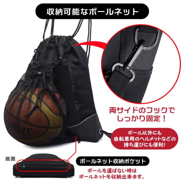 サッカー ボールが入るリュック 収納 入れ ポケットたくさん ボール入るボールの入る ボールリュック ナップサック ボールバッグ袋ネット ボールネット はっ水撥水 大容量カバン バスケ用 バスケットボール キッズ 子供ジュニア小学生 軽量 巾着 ブラック黒ブルー青レッド赤