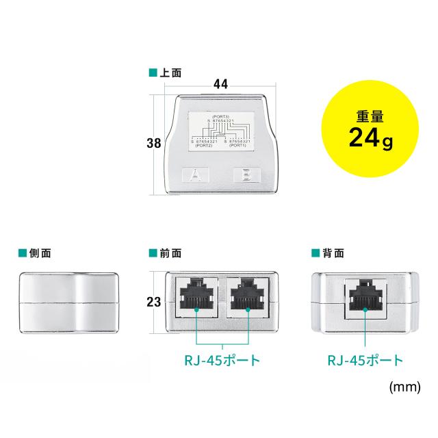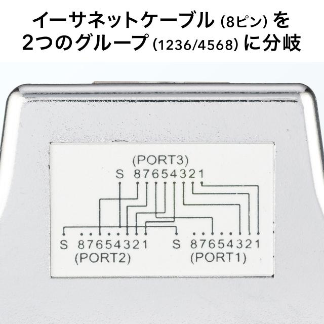 ●PC2台の信号を1本のLANケーブル(8芯)でCAT5伝送が可能な2分岐アダプタです。●イーサネットケーブル(8ピン)を2つのグループ(1236/4568)に分岐します。