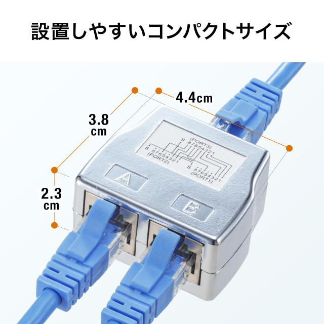 LANケーブル延長コネクタ 2分岐アダプタ 中継 二股 RJ45 CAT5[500-LAN2EX5-1]