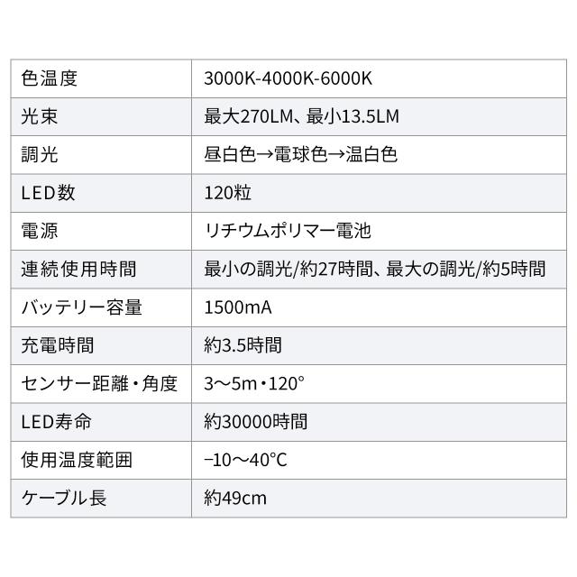 ●約2.5時間のUSB充電で、連続点灯は最大5時間です。