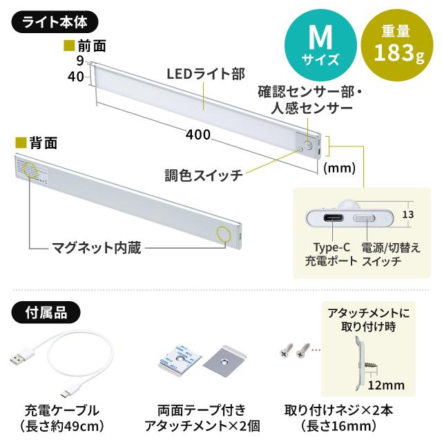 人感センサーライト LEDセンサーライト USBライト 薄型 充電式 最大350ルーメン 3色色温度変更 明るさ無段階 40cm ブラック シルバー[800-LED073]